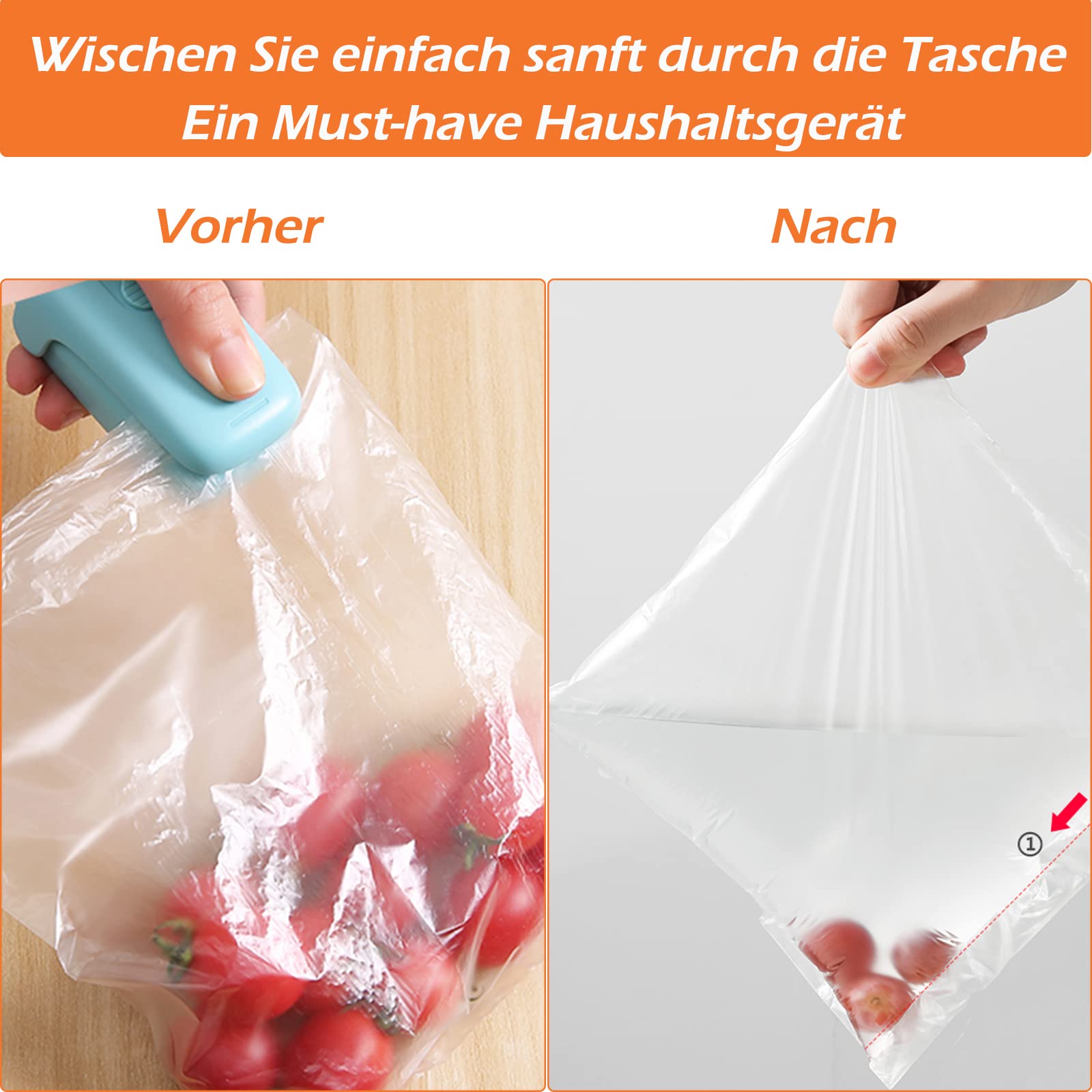 Lebensmittel frisch halten war noch nie so einfach! 🍎 Dieser Mini-Versiegeler ist dein kleiner Helfer für die Küche.\n\n2-in-1 Funktion:\n• Beutel versiegeln und luftdicht machen\n• Integrierter Cutter zum Öffnen\n• Perfekt für Snacks und Vorräte\n\nTechnische Highlights:\n• Kein Vorheizen nötig - sofort einsatzbereit\n• USB-C wiederaufladbar (Kabel inklusive)\n• 2 Stunden laden = 10-15 Tage Nutzung\n• Mit Magnet für Kühlschrank-Montage\n• Ultra-kompakt und tragbar\n\nSo funktioniert's:\nEinschalten, Beutelende zwischen die Heizstäbe stecken, kurz warten - fertig versiegelt! Verhindert das Austrocknen und Verderben von Lebensmitteln.\n\nIdeal für:\n• Chips- und Snack-Tüten\n• Frischhaltebeutel\n• Gefrierbeutel\n• Vorratsdosen-Abdeckungen\n• Unterwegs beim Camping\n\nVorteile:\n• Spart Platz in der Küche\n• Reduziert Lebensmittelverschwendung\n• Einfache Handhabung\n• Umweltfreundlich (keine Batterien)\n\nOb zu Hause oder unterwegs - mit diesem praktischen Helfer bleiben deine Lebensmittel länger frisch! Einfach aufladen und loslegen! 🔋