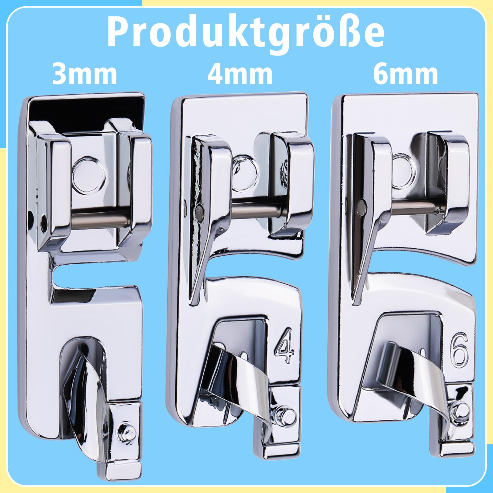 Drei verschiedene Größen: 3mm, 4mm und 6mm Nähkantendruckfüße. Für verschiedene Stoffe und Nähtechniken.