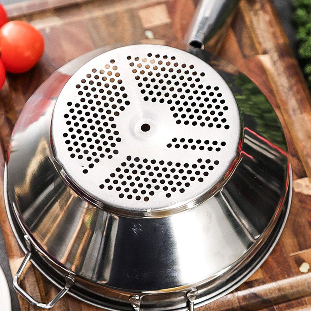 Kochst du gerne frisch und magst selbstgemachte Pürees und Saucen? Diese Edelstahl-Lebensmittelmühle macht's dir leicht! Mit 3 austauschbaren Sieben aus Edelstahl bereitest du feine, mittlere oder grobe Konsistenzen zu. Das feine Sieb ist perfekt für Babynahrung und Soßen, das mittlere für Apfelmus und Gemüsesuppe, und das grobe für kräftige Pürees. Die Mühle ist komplett aus Edelstahl und Kunststoff gefertigt, misst 33x20cm und wiegt 664g. Der ergonomische Griff mit Federung dreht sich leicht und der weiche Ball am Ende liegt gut in der Hand. Die Anti-Rutsch-Griffe an der Schüssel sorgen für sicheren Halt. Einfach die gewünschte Scheibe einsetzen, Lebensmittel in die Schüssel geben und den Griff drehen - schon hast du perfektes Püree! Perfekt für Tomatensauce, Kartoffelpüree, Obstmus und vieles mehr. Mach deine Küche zur Gourmet-Küche!