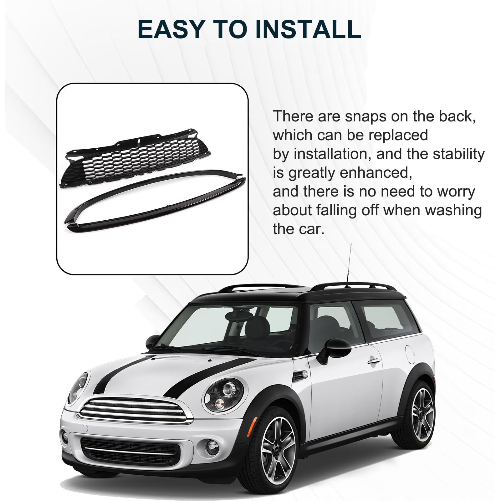 Willst du deinem Mini einen sportlicheren Look verpassen? Dieser Waben-Kühlergrill in schwarzem Hochglanz ist genau das Richtige! Ersetzt einfach deinen originalen Grill und gibt deinem Mini sofort mehr Aggressivität und Straßenpräsenz. Passt perfekt für Mini One, Cooper, Cooper S und JCW der Baureihen R56 (2006-2013), R57 (2007-2015), R58 (2010-2015) und R59 (2011-2015). Absolute Passgenauigkeit garantiert - kein Basteln oder Modifizieren nötig. Einfacher Einbau: Alten Grill raus, neuen rein - das war's! Hergestellt in sehr guter Qualität, das Material fühlt sich wertig an und die Verarbeitung ist top. Kommt original verpackt an und ist sofort montagebereit. Wichtig: Wir empfehlen die Montage durch eine KFZ-Werkstatt, besonders wenn du dir unsicher bist. Achtung: Der Grill kann scharfkantig sein - Vorsicht bei der Montage! Verpackungsmaterial nicht in Kinderhände geben (Erstickungsgefahr). Perfekt für alle Mini-Fans, die ihrem Fahrzeug mehr Individualität verleihen wollen. Sieht aus wie teure Originalteile, aber zu einem fairen Preis. Macht deinen Mini zum echten Hingucker - ob in der Stadt oder auf Treffen!