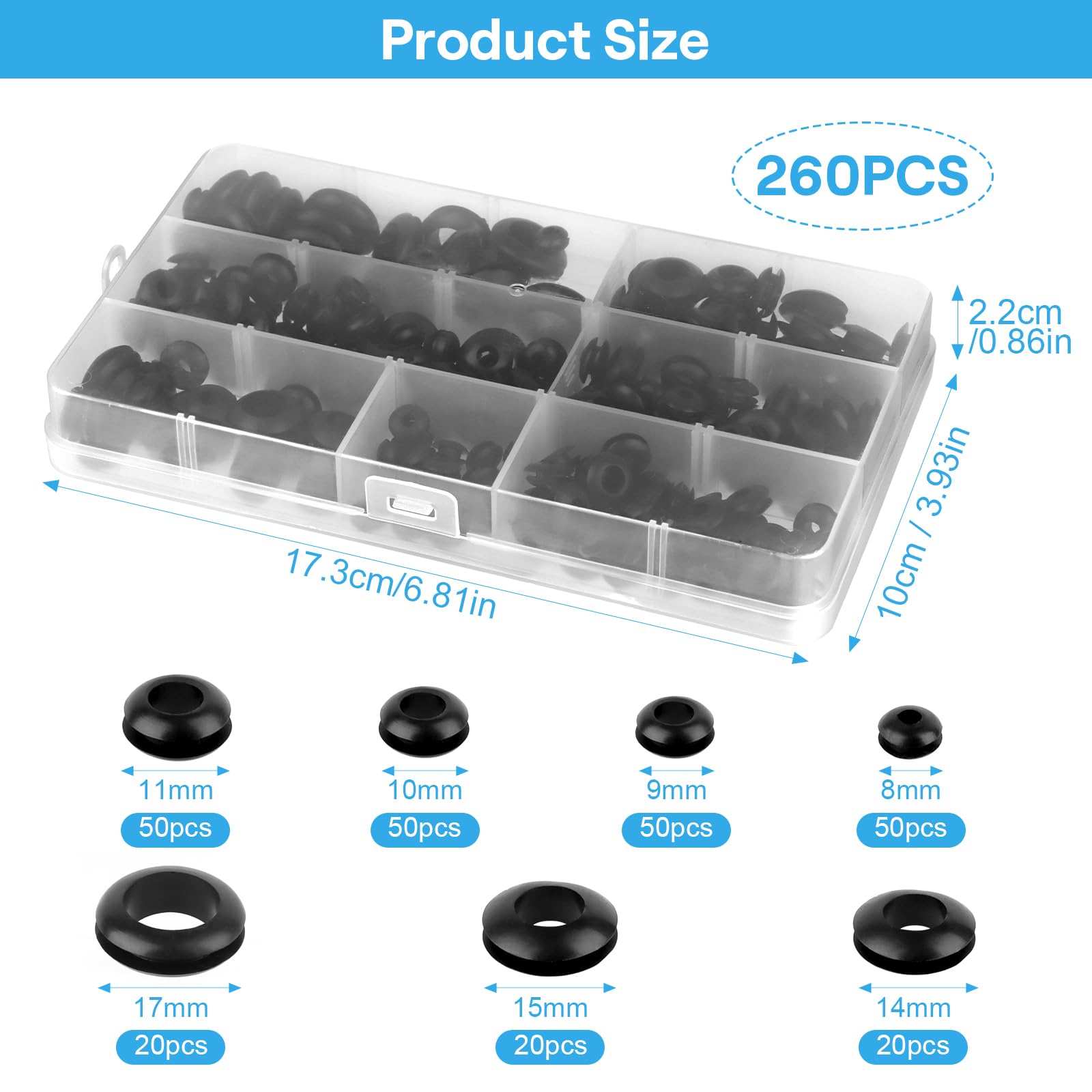 Ordnung muss sein! Dieses 260-teilige Gummi-Kabeldurchführung Set bringt System in deine Kabelinstallation. Enthalten sind 7 Größen von 8-17mm Durchmesser - perfekt für Löcher in Gehäusen, Wänden oder Metallschränken. Die schwarzen Gummitüllen mit O-Ring-Design schützen Kabel vor scharfen Kanten und sorgen für Staub- und Spritzwasserschutz. Einfach ins Bohrloch drücken, Kabel durchführen - fertig! Kommt in praktischer Sortierbox für übersichtliche Aufbewahrung. Ideal für Auto, Elektrogeräte, Werkstatt und Haushalt. Qualitäts-Gummi der nicht reißt. Mach deine Installationen professionell und sicher!