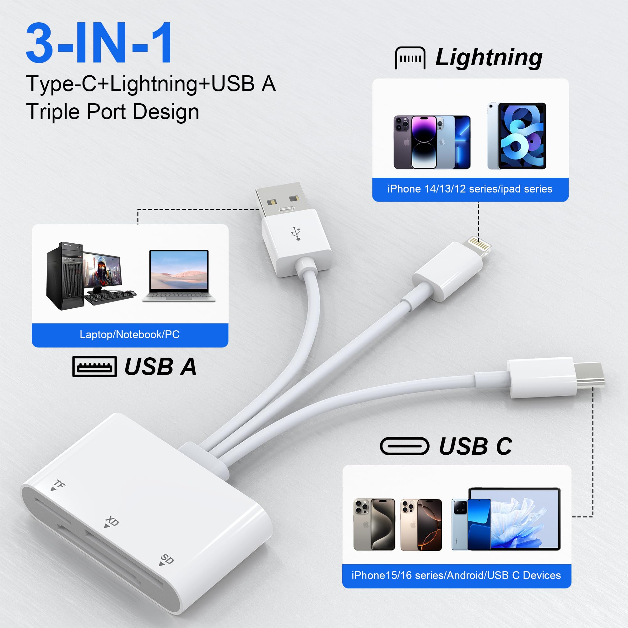 Endlich alle deine Fotos und Videos schnell übertragen! Dieser praktische 3-in-1 Kartenleser hat Anschlüsse für Lightning, USB-C UND USB-A - passt also zu fast allen Geräten. Du kannst SD-, Micro SD- und XD-Karten lesen, super für Fotos von deiner DSLR, GoPro oder Drohne. Mit 480 Mbit/s Übertragungsgeschwindigkeit geht das ratzfatz. Einfach einstecken und loslegen - keine Treiber nötig! Wichtig: Immer nur eine Karte auf einmal verwenden. Kompatibel mit iPhone 13-16, iPad, Android und PCs. Für alle, die viel unterwegs fotografieren und ihre Bilder schnell teilen wollen!