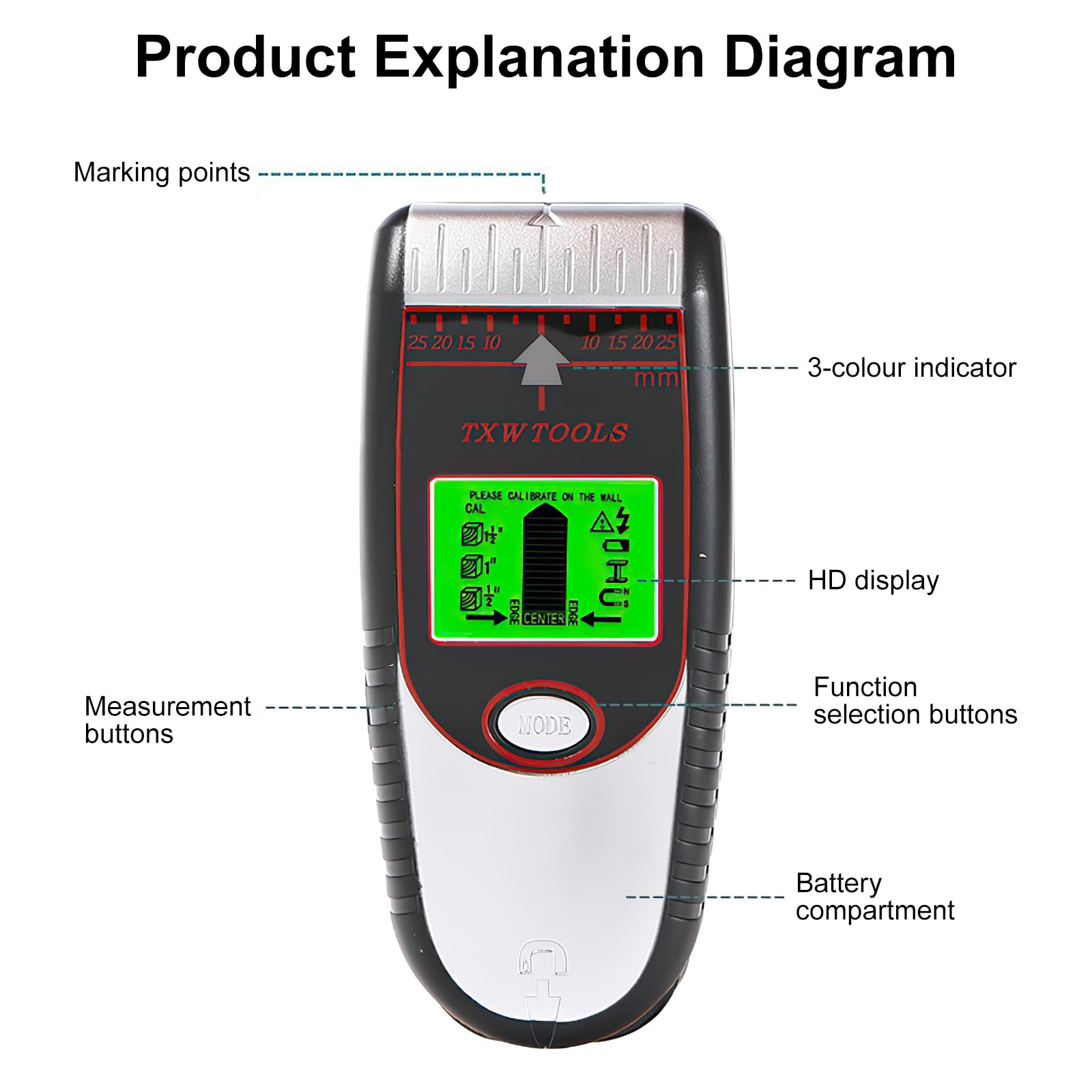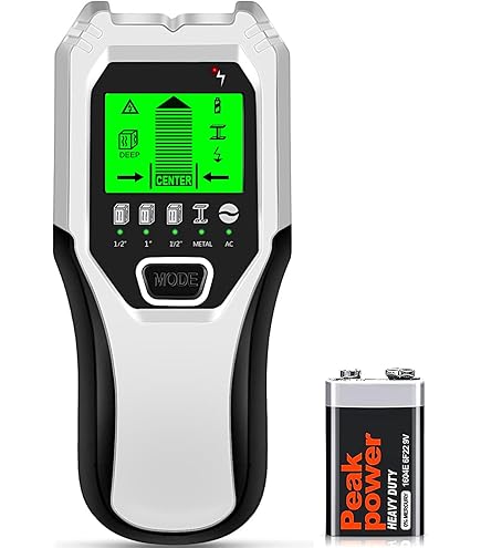 Nie wieder blind in die Wand bohren! Dieser praktische 7-in-1 Detektor findet alles, was in deinen Wänden versteckt ist: Metallteile wie Bewehrungsstahl bis 60 mm tief, Holzbalken in 12/25/38 mm Tiefe und sogar stromführende Leitungen bis 51 mm. Einfache Kalibrierung - einfach einschalten, MODE-Taste drücken und los geht's. Das Display zeigt dir genau an, was sich wo verbirgt. Perfekt für Heimwerker, die sicher arbeiten wollen. Ob du Bilder aufhängen, Regale montieren oder Kabel verlegen willst - mit diesem Scanner bohrst du nie wieder daneben!