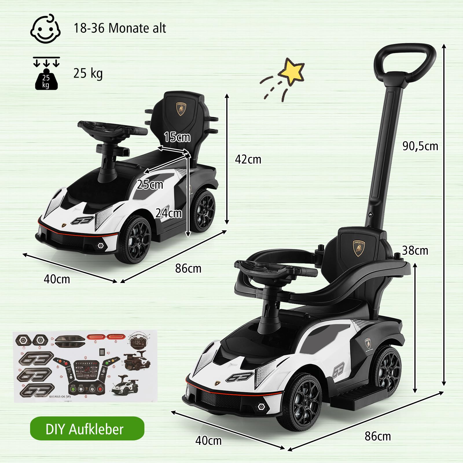 Das ultimative Spielauto für die Kleinen! Dieses GOPLUS 3-in-1 Auto wächst mit deinem Kind mit: erst als Schiebeauto mit Griff (12-24 Monate), dann als Laufauto (24-30 Monate) und schließlich als cooles Aufsitzauto (30-36 Monate). Mit realistischen Licht- und Soundeffekten - macht richtig Spaß! Das verstellbare Sonnendach schützt vor zu viel Sonne. Extra sicher mit Schutzgeländer, Sicherheitsgurt und rutschfesten Pedalen. Verstecktes Staufach für Spielsachen und Snacks. Bis 25kg belastbar - hält was aus! Einfach aufbauen und losfahren!