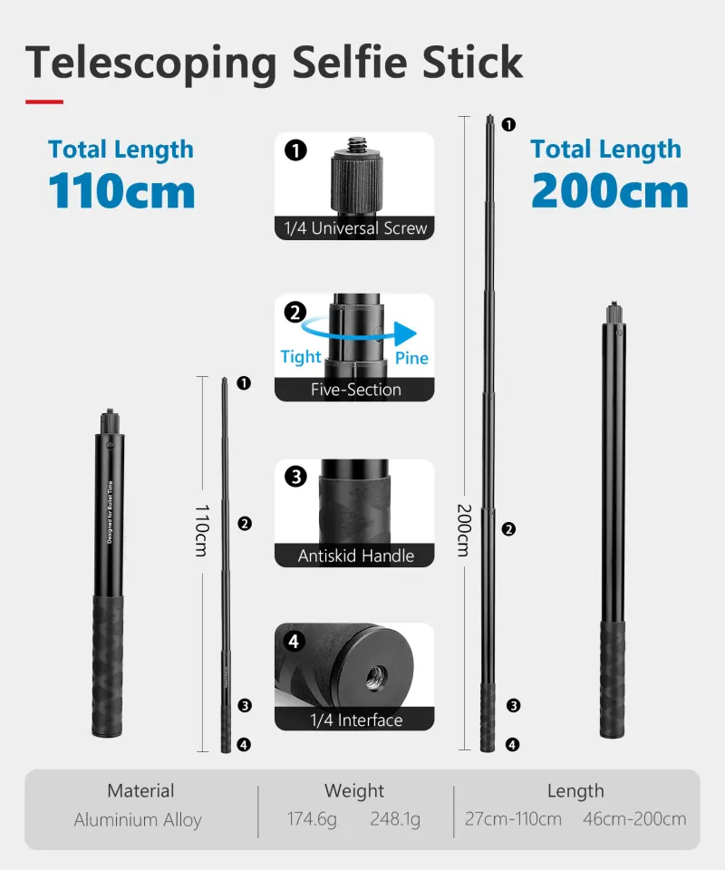 All-in-One für deine Insta360! Dieser Selfie-Stick ist gleichzeitig Stativ - von 24cm auf 119cm ausziehbar (Stativ bis 122cm). Aus Aluminium und Kunststoff, leicht aber stabil. Unsichtbar in Aufnahmen, perfekt für 360° Videos. Einfach auseinanderziehen, Stativ mit einem Knopf entriegeln. Rutschfester Griff und stabile Füße. Passt für X5, X4, X3, GO 3, Ace Pro. Ob Selfies, Gruppenbilder oder Time-Lapse - damit bist du immer gut aufgestellt. Einfach praktisch für unterwegs!