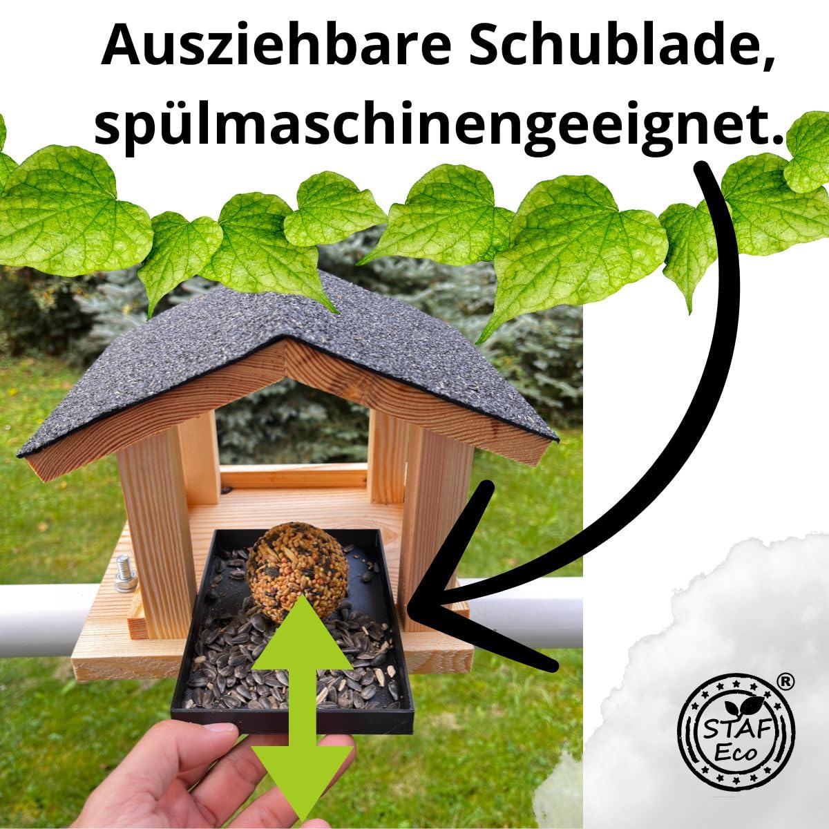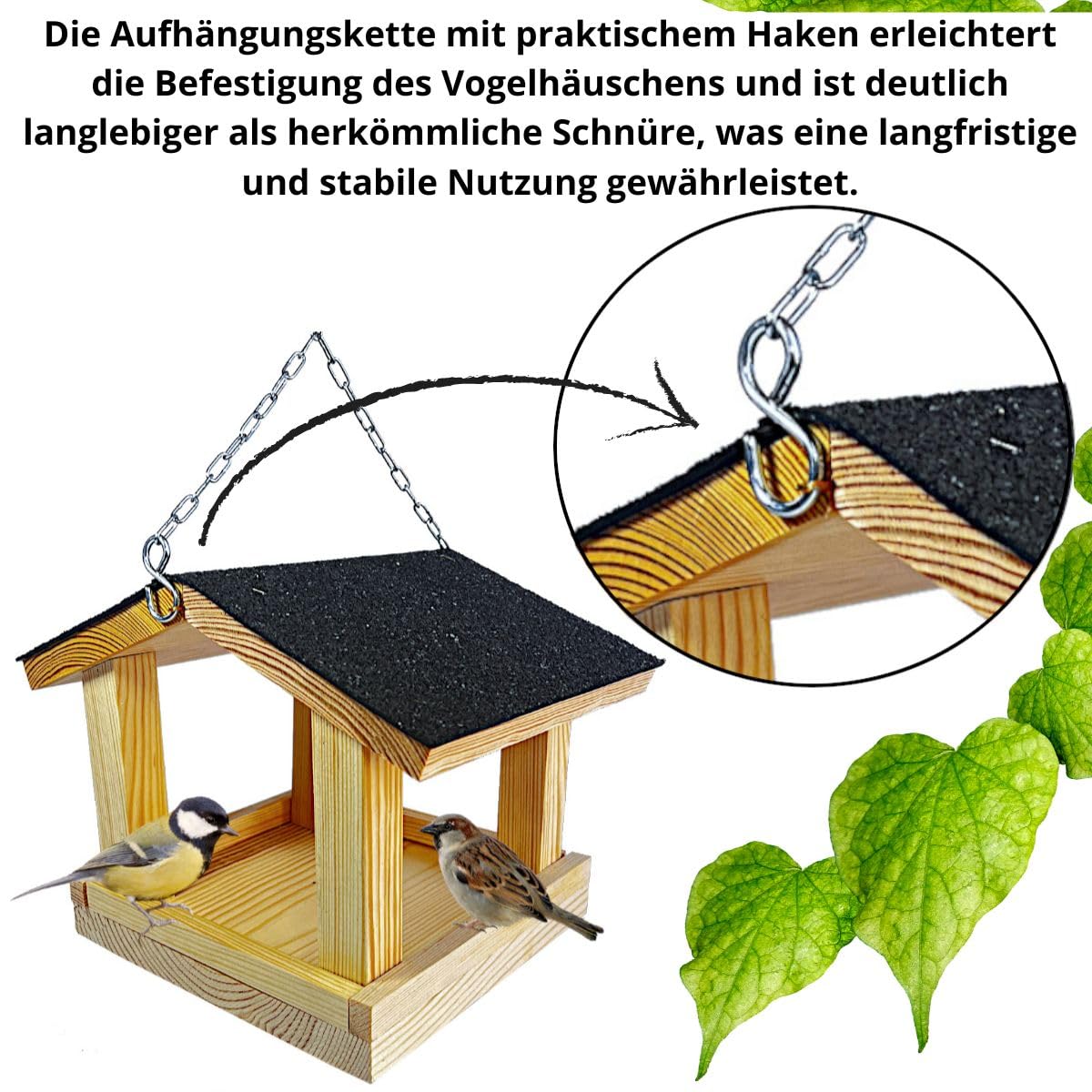 Ein Paradies für Vögel! Dieses stabile Vogelfutterhaus bringt Leben in deinen Garten. Anders als billige Modelle hält dieses Haus wirklich was aus: Das Dach aus robuster Bitumenpappe trotzt Regen, Schnee und Sonne. Die dicken Holzbretter sind mit Zimmermannsschrauben verschraubt - ganz ohne Leim! Die herausnehmbare Futterschale kannst du einfach in die Spülmaschine stellen. Mit der stabilen Stahlkette hängst du es blitzschnell auf - und genauso schnell nimmst du es wieder ab. Ob am Baum, auf dem Balkon oder an der Hauswand - die Vögel werden es lieben! Ein Futterhaus, das nicht nur eine Saison hält, sondern viele Jahre Freude bereitet. Beobachte Meisen, Finken und Co. aus nächster Nähe!