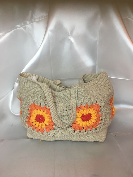 Wow, diese gehäkelte Tasche ist ja wunderschön! Die Blumenstickerei in diesem warmen Karamellbraun sieht einfach nur edel aus. Das ist richtige Handarbeit - da steckt Liebe zum Detail drin.