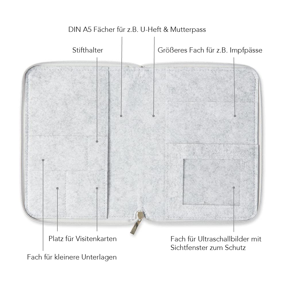 Alles schön geordnet für die aufregende Zeit der Schwangerschaft! Diese wunderschöne A5-Hülle aus Filz bewahrt deine wichtigsten Dokumente sicher auf! Platz für Mutterpass, U-Heft, Ultraschallbilder, Impfpass und Versicherungskarte! Der Reißverschluss sorgt dafür, dass nichts verloren geht! Hochwertig verarbeitet begleitet sie dich von der Schwangerschaft bis weit in die Kindheit hinein! Das zeitlose Design gefällt jeder Mama - ob als Geschenk zur Schwangerschaft oder für dich selbst! Einfach alles reinsortieren und immer griffbereit haben! Perfect für alle werdenden Mütter, die Wert auf Ordnung und schöne Accessoires legen!