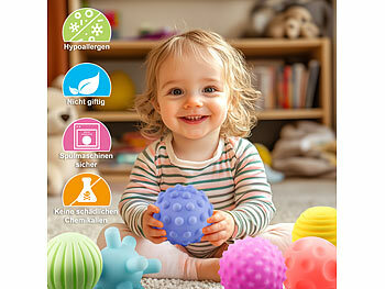 Für neugierige Babyhände! Diese 4 Silikonbälle haben verschiedene Strukturen zum Fühlen und Erkunden. Weich und sicher, sogar lebensmittelecht. Jeder Ball lässt sich aufschrauben – du kannst kleine Dinge reinlegen, dann wird's eine Rassel! Fördert die Motorik, die Hand-Augen-Koordination und den Tastsinn. Leicht zu reinigen und robust. Ein tolles Geschenk für Babys ab 6 Monaten. Einfach hingelegt und staunen, was dein Kleines damit macht!