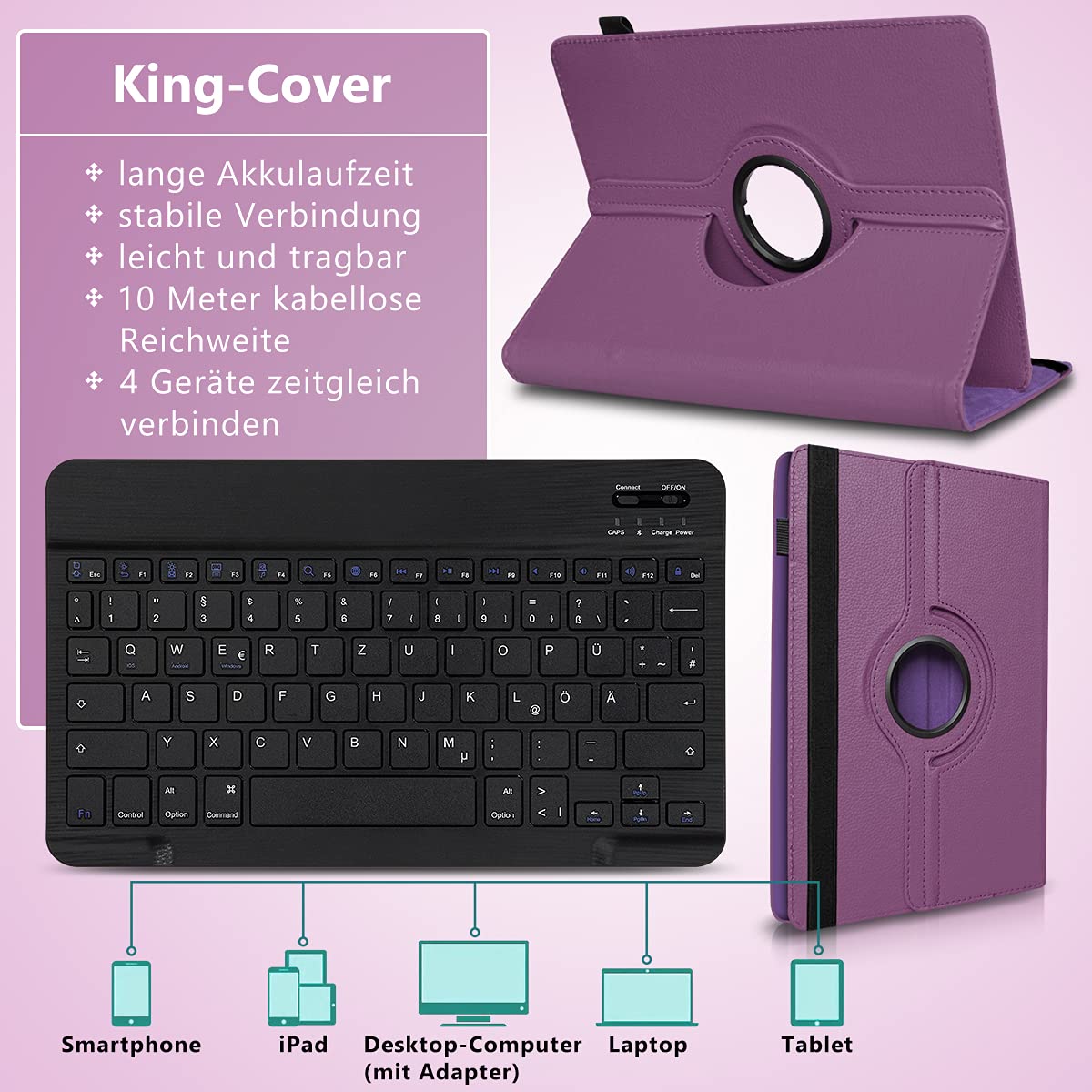 Dein Tablet wird zum vollwertigen Arbeitsgerät! Diese coole UC-Express Kombi aus Schutzhülle und Bluetooth-Tastatur macht aus deinem Blackview Tab im Handumdrehen einen Mini-Laptop. Die Tastatur hat deutsches QWERTZ-Layout und verbindet sich per Bluetooth 3.0 mit Windows, Mac, iOS und Android. Du kannst sogar bis zu 4 Geräte gleichzeitig koppeln und zwischen ihnen hin- und herwechseln - mega praktisch! Die robuste Hülle schützt dein Tablet vor Kratzern und Stößen, und mit der verstellbaren Standfunktion wird's zum perfekten Kino-Ersatz. Der 260mAh Akku hält bis zu 45 Stunden durch, im Standby sogar 90 Tage! Im Lieferumfang ist alles dabei: die Hülle mit Tastatur plus Micro-USB Ladekabel. Perfekt für Blackview Tab 16, 15, 13, 12, 11, 10 Pro, 9, 8 und 8E. Ob fürs Homeoffice, zum Surfen oder für unterwegs - mit diesem Set hast du immer die richtige Tastatur zur Hand!