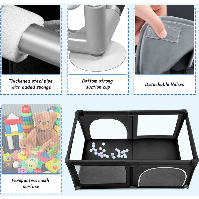 Wow, was für ein Spielparadies für dein Baby! Dieses Laufgitter kommt mit 50 kunterbunten Bällen und sogar einem Basketballkorb - da ist Spielspaß garantiert! Mit den Maßen 180 x 120 x 66 cm bietet es genug Platz zum Toben, aber die Höhe ist so gewählt, dass dein Kleines nicht herauskommen kann. Das robuste Stahlrohr-Gestell ist extra stabil und die dreieckigen Verbindungen geben zusätzlichen Halt. Die Ecken sind weich gepolstert, damit sich dein Kind nicht wehtut. Das Oxford-Gewebe ist verschleißfest und angenehm weich. Die 4 Saugnäpfe und 4 Zugringe bieten weitere Spielmöglichkeiten. Und wenn's mal nicht gebraucht wird: einfach zusammenfalten und platzsparend verstauen. So förderst du die motorische Entwicklung deines Kindes und hast gleichzeitig die Hände frei. Perfekt für Zuhause oder auch für mehrere Kinder zum gemeinsamen Spielen!