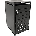 Features: Gasdruckdämpfer am Deckel, Magnetverschlüsse, verstellbare Füße für unebenen Boden und verstellbare Schienen für verschiedene Tonnengrößen.