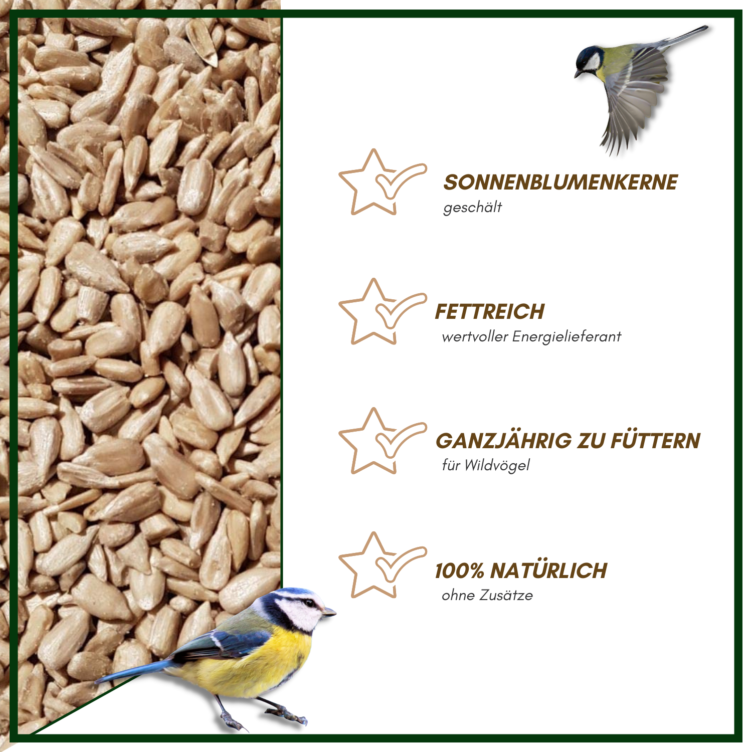 Ohne Schale - so können die Vögel sofort mit dem Fressen beginnen und verschwenden keine Energie. Enthält wertvolle Fettsäuren und Nährstoffe für gesunde, aktive Vögel.
