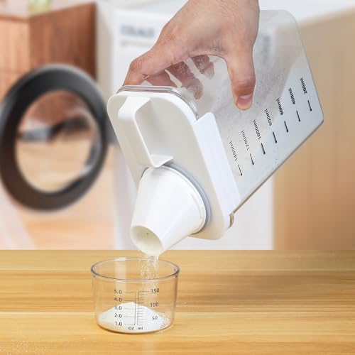 Endlich Ordnung im Waschbereich! Dieser praktische Behälter fasst 5,5 Liter Waschpulver und hält es mit seinem dichten Deckel frisch und trocken. Der clevere Druckmechanismus gibt genau die richtige Menge ab - kein Verkleckern mehr! Aus durchsichtigem PET-Material siehst du immer, wie viel noch drin ist. Die große Öffnung macht das Nachfüllen leicht, und die glatten Innenflächen sind super einfach zu reinigen. Nicht nur für Waschmittel geeignet - auch Tierfutter, Reis oder Müsli bleiben darin perfekt frisch. Modernes Design, das in Bad, Küche oder Vorratsraum passt. Mach deinen Waschtag einfacher und organisiert!