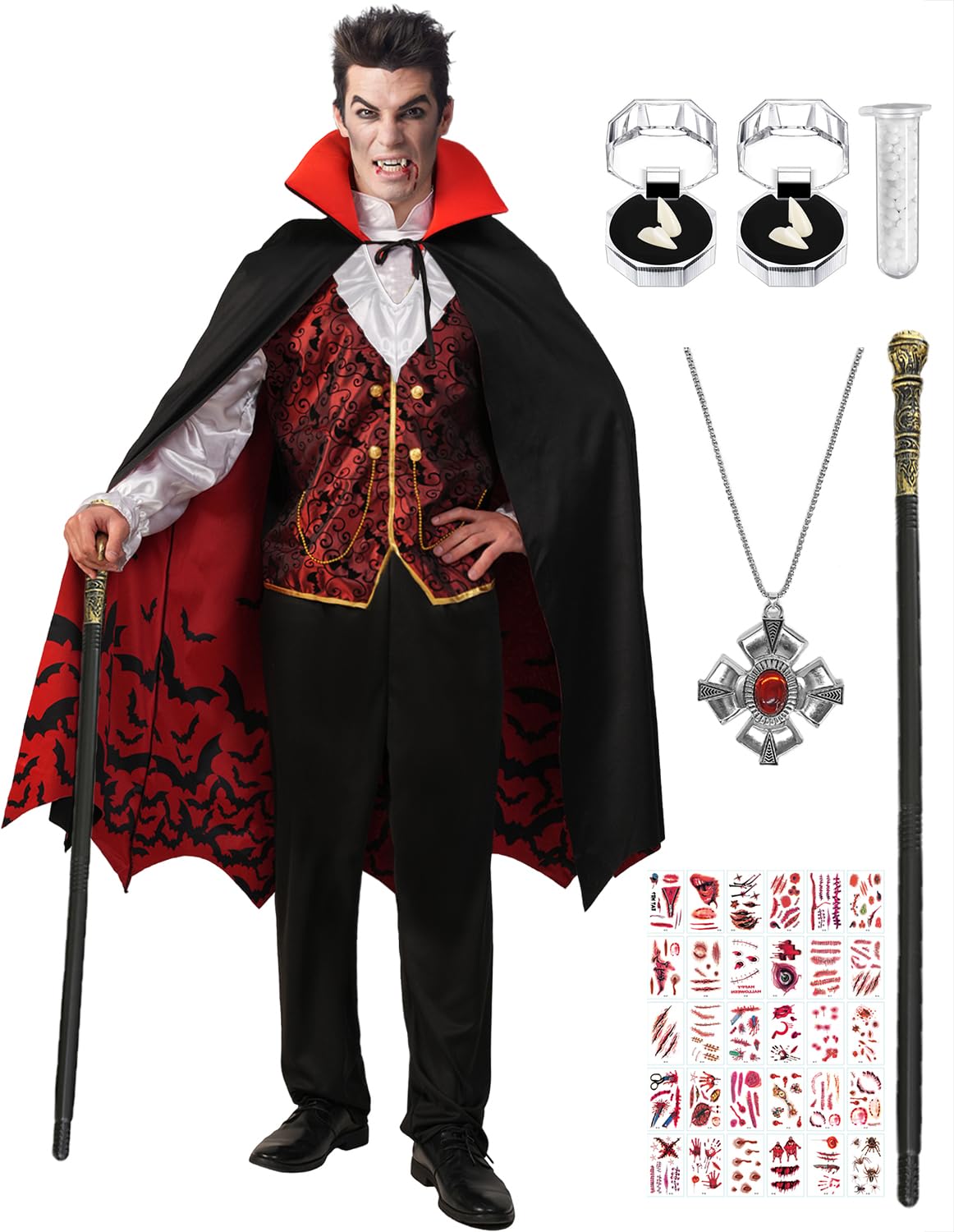 Werde zur eleganten Vampirdame! Dieses komplett Kostüm-Set enthält alles, was du für den perfekten Vampir-Look brauchst: Ein wunderschönes schwarz-rotes Gothic-Kleid mit markantem Stehkragen, eine rubinrote Halskette, Ohrstecker, zwei Sets Vampirzähne und sogar das Werkzeug zum Anpassen der Zähne. Das Kleid hat verzierte Spitzenborten mit Rosenmustern und elegante Glockenärmel, die richtig was hermachen. Verstellbare Bänder an Brust und Taille sorgen für perfekte Passform und betonen deine Figur. Aus weichem, atmungsaktivem Material ist es auch bei langen Partys bequem zu tragen. Erhältlich in Größen S bis 2XL - bitte vorher die Größentabelle checken! Perfekt für Halloween, Karneval, Cosplay-Events oder Mottopartys. Damit stichst du garantiert aus der Menge heraus und fühlst dich wie eine echte Vampirkönigin. Einfach anziehen und verzaubern!