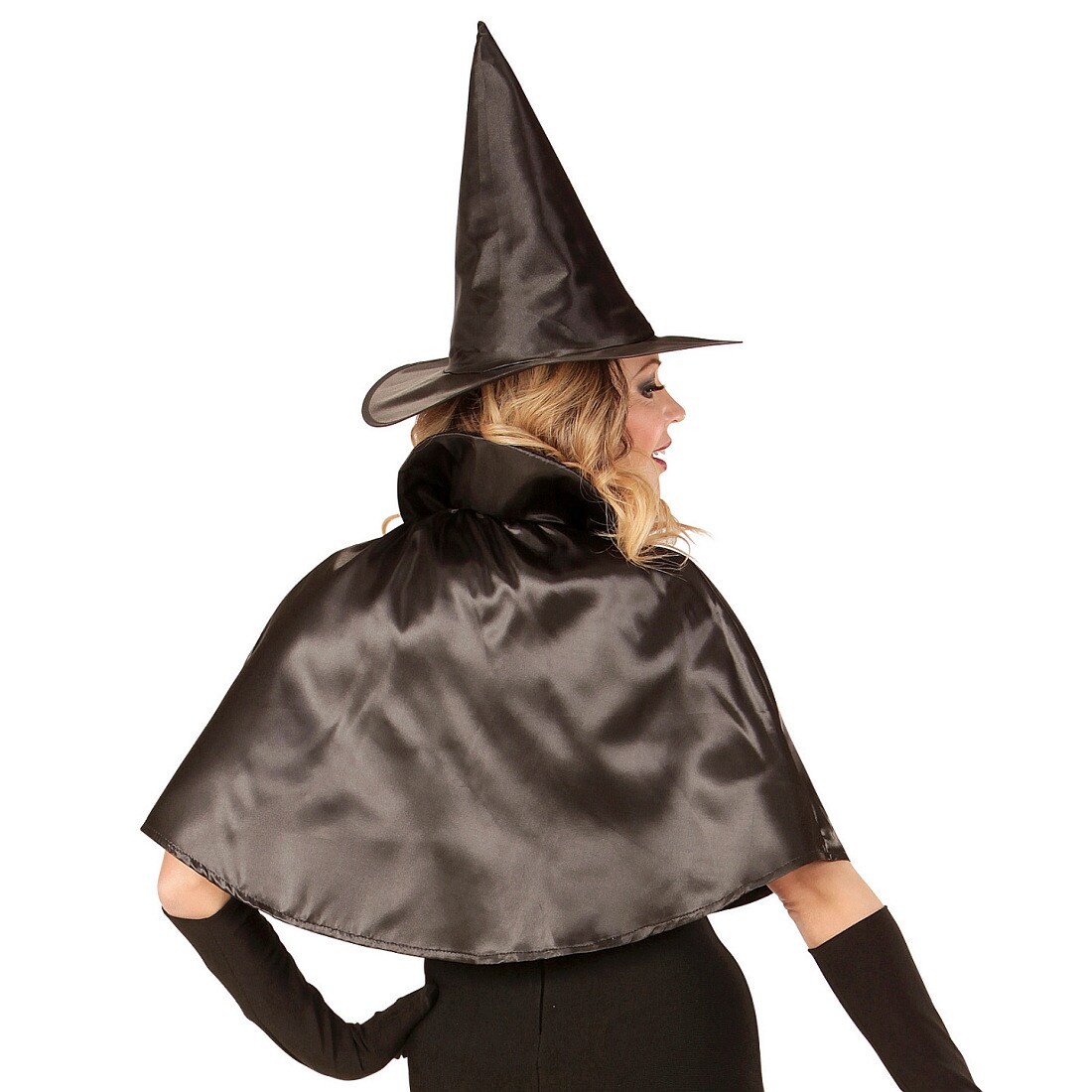 Hexenkostüm Damen 3-teilig | Mit Umhang, Hexenhut & Handschuhen - Schwarz Für Halloween & Karneval