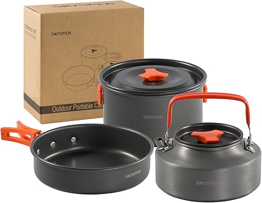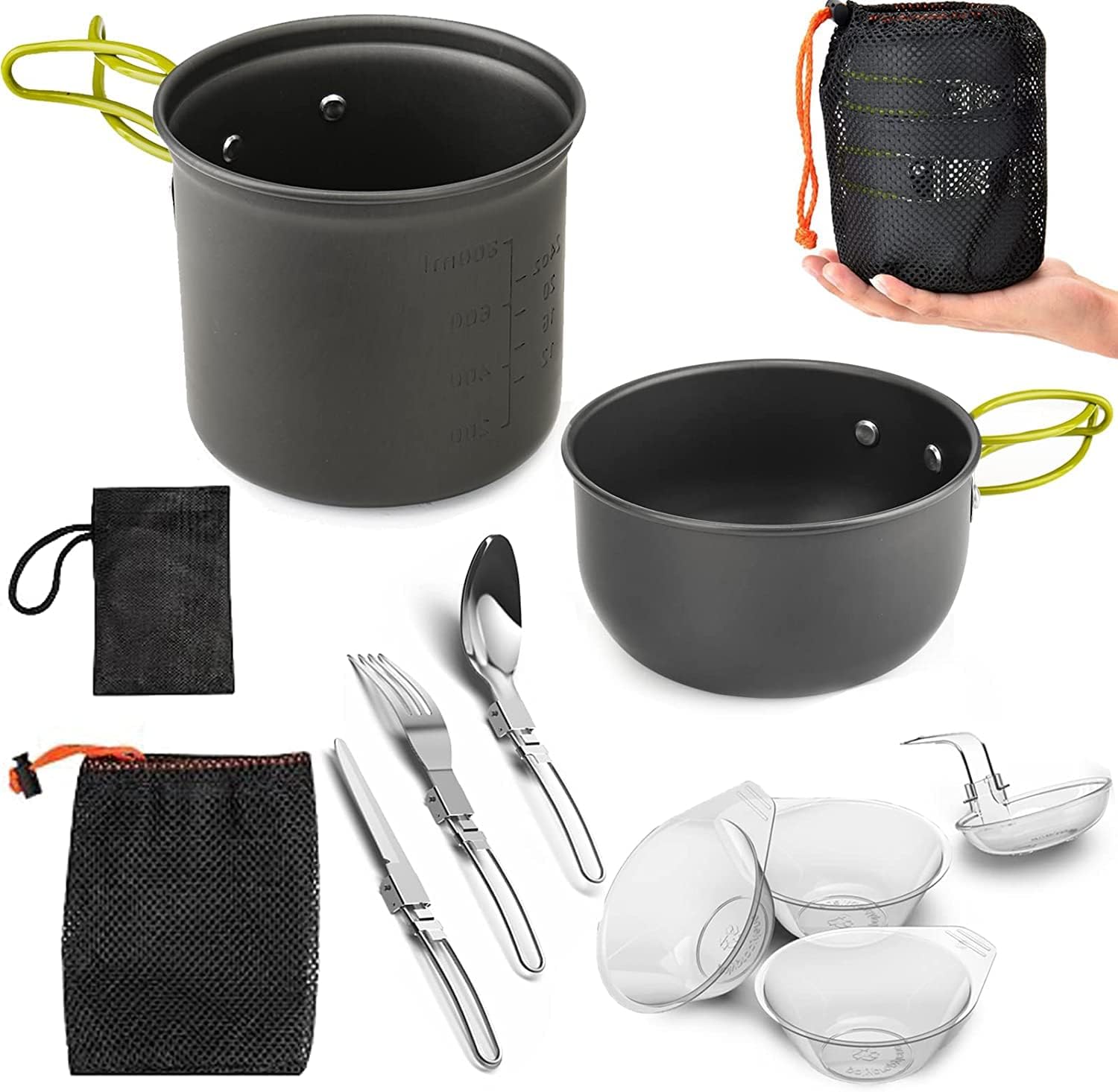 Für alle Outdoor-Fans: Dieses Udbrud Camping Kochset ist dein perfekter Begleiter! Ultraleicht (nur 300g) und super kompakt - alles verstaut in einer Netztasche. Dabei ist alles dabei: 1 Topf, 1 Pfanne (beide mit Antihaftbeschichtung), Löffel, Gabel und Messer - und alles klappbar! Die Griffe sind hitzebeständig, damit du dich nicht verbrennst. Das Aluminiummaterial leitet Wärme super schnell - spart Zeit und Gas. Und keine Sorge: Alles ist lebensmittelecht, ungiftig und easy zu reinigen. Ob beim Camping, Wandern, Festival oder Picknick - damit kochst du überall dein Essen. Kann auch als Tasse, Messbecher oder was du dir vorstellen kannst verwendet werden. Einfach zusammenpacken und ab ins Abenteuer!