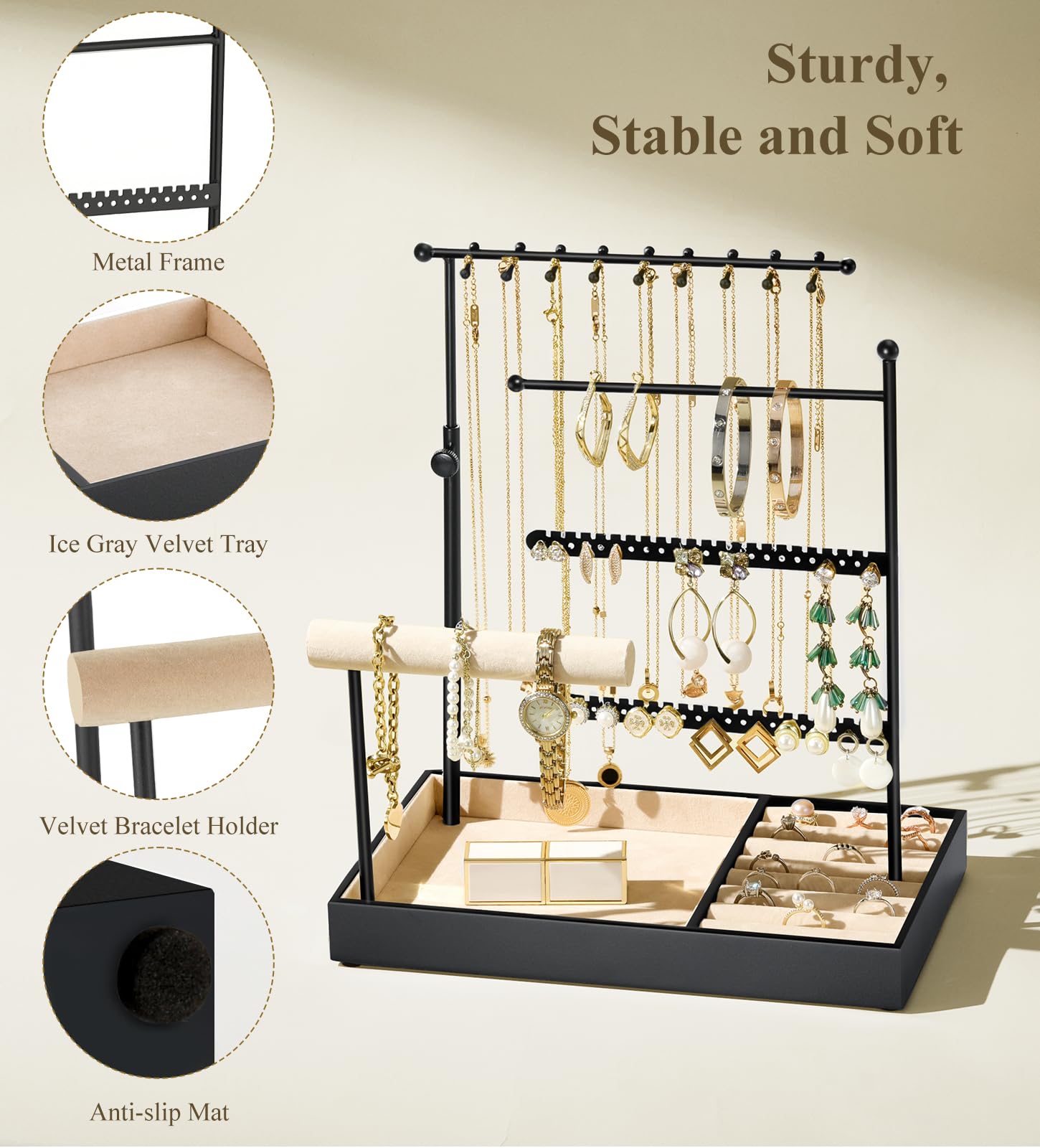 Was ich liebe: Die Höhe ist verstellbar von 20,5 bis 39 cm - passt also für kurze Halsketten genauso wie für lange Statement-Teile. Der Metallrahmen ist super stabil, wackelt nicht, selbst wenn er voll behängt ist. Und der Samt schützt deine Lieblingsteile vor Kratzern.