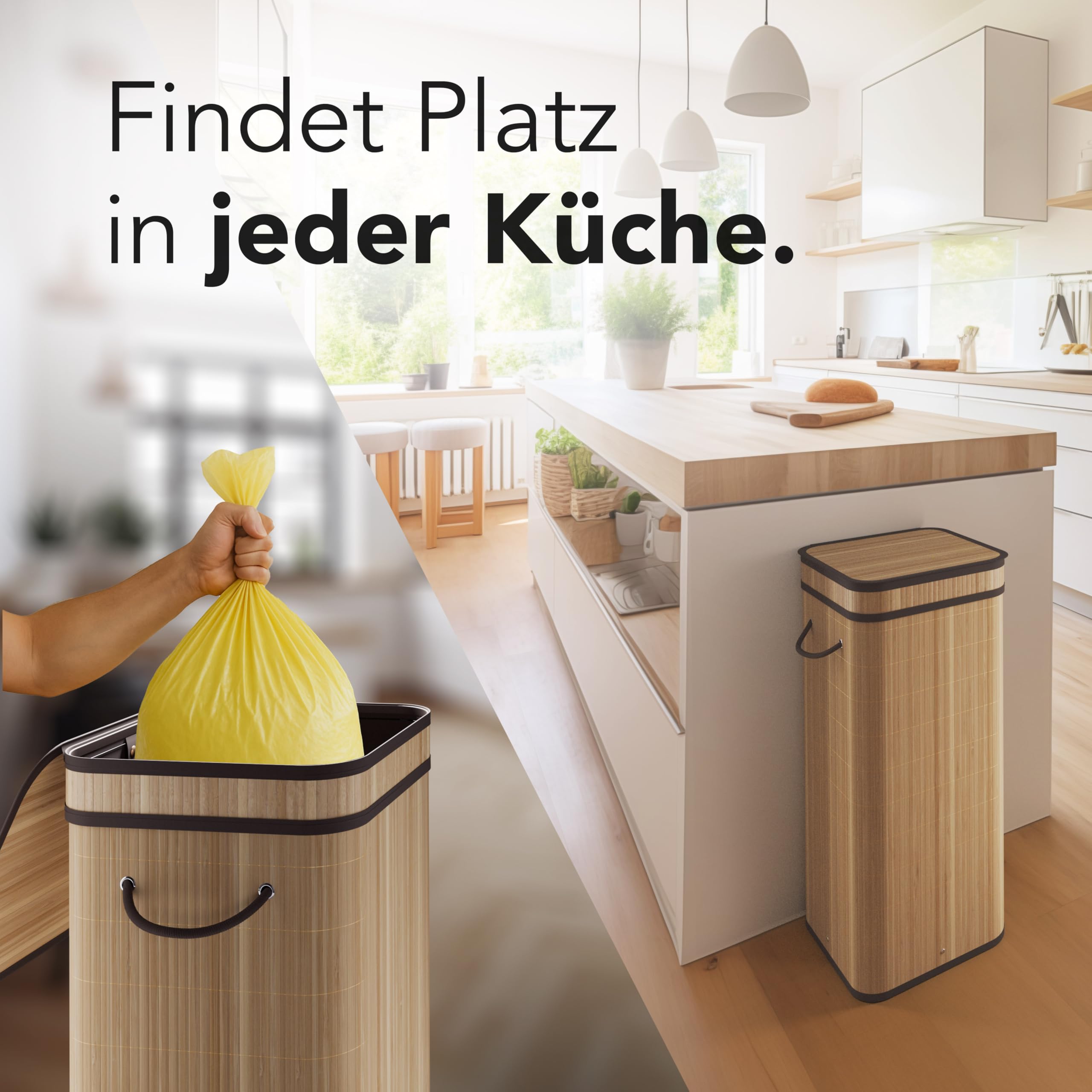 Endlich eine ordentliche Lösung für deine Gelben Säcke! Dieser stylische Ständer aus Bambus sieht nicht nur gut aus, sondern ist auch super praktisch. Mit 80 Litern Fassungsvermögen passt er perfekt für alle Standard-Gelben Säcke. Der geruchsdichte Deckel sorgt dafür, dass keine unangenehmen Gerüche in deiner Küche oder im Haushaltsraum entstehen. Aus nachhaltigem Bambus gefertigt, ist er nicht nur umweltfreundlich, sondern auch richtig stabil - kippt nicht um, selbst wenn er voll ist. Der Aufbau ist kinderleicht, du brauchst kein Werkzeug und hast ihn in wen Minuten einsatzbereit. Die große Öffnung macht das Befüllen super einfach, und das schlichte Design passt sich jedem Einrichtungsstil an. Perfekt für alle, die Wert auf ordentliche Mülltrennung legen und dabei nicht auf Style verzichten wollen. Ob in der Küche, im Flur, Keller oder Garage - dieser Ständer bringt Ordnung in dein Recycling-System und sieht dabei noch richtig gut aus! Ein Must-have für jeden umweltbewussten Haushalt.