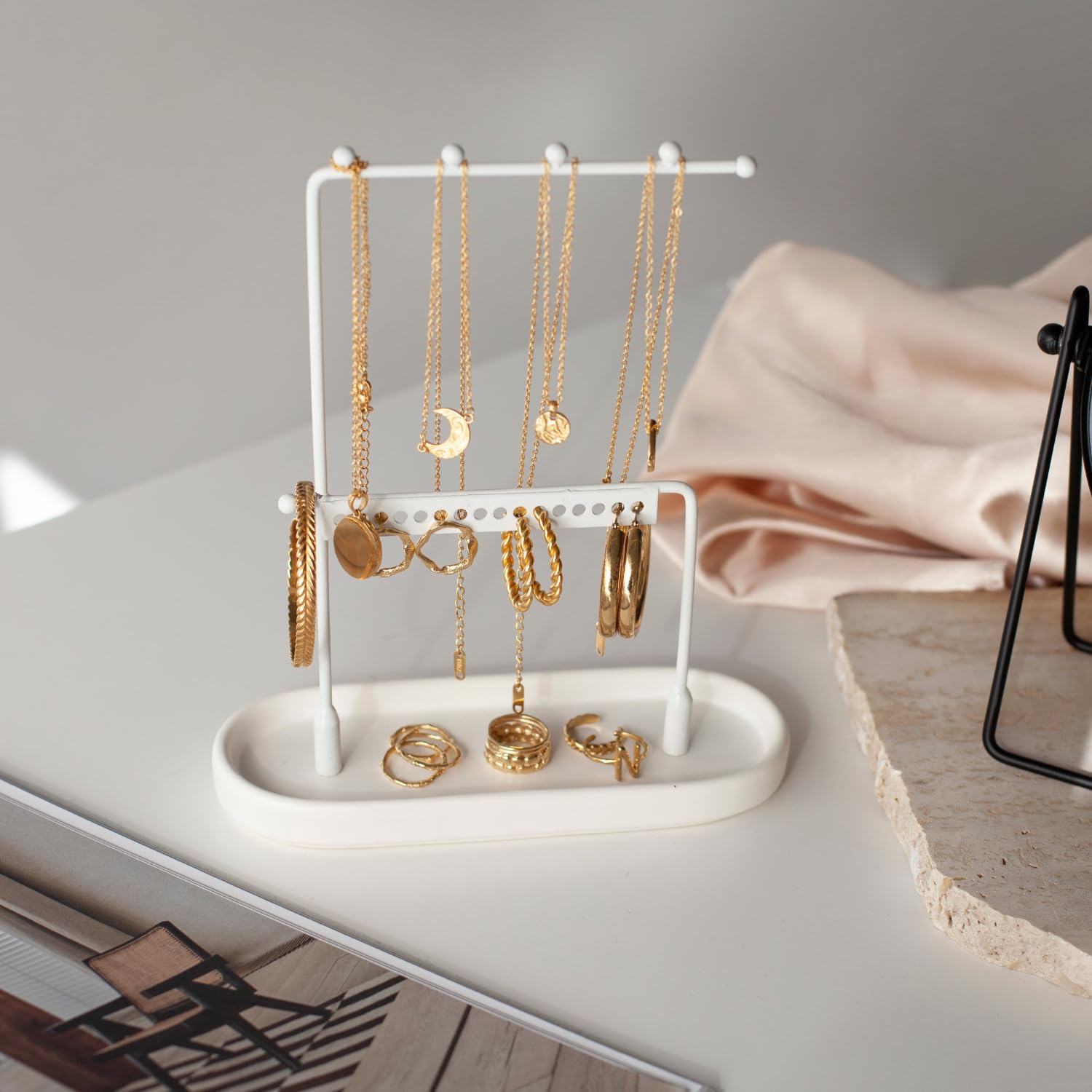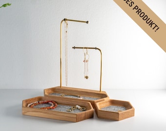 Endlich Ordnung im Schmuckkästchen! Dieser Tissting Schmuckständer in Gold ist nicht nur praktisch, sondern sieht auch noch super stylisch aus. Aus robustem Eisen gefertigt - langlebig und stabil. Die abgerundeten Haken verhindern, dass sich Ketten und Armbänder verheddern. Das offene Design gibt dir sofort Überblick über deine gesamte Schmucksammlung. Perfekt für Halsketten, Armbänder, Anhänger, Ohrringe und sogar Schlüssel oder Uhren! Die goldene Oberfläche verleiht jedem Raum einen modernen, eleganten Look. Ob im Schlafzimmer, Badezimmer oder fürs Juweliergeschäft - dieser Ständer macht überall eine gute Figur. Einfach aufstellen und den Schmuckchaos ein für alle Mal beenden! Deine Schmuckstücke sind nicht nur gut organisiert, sondern auch schön präsentiert.
