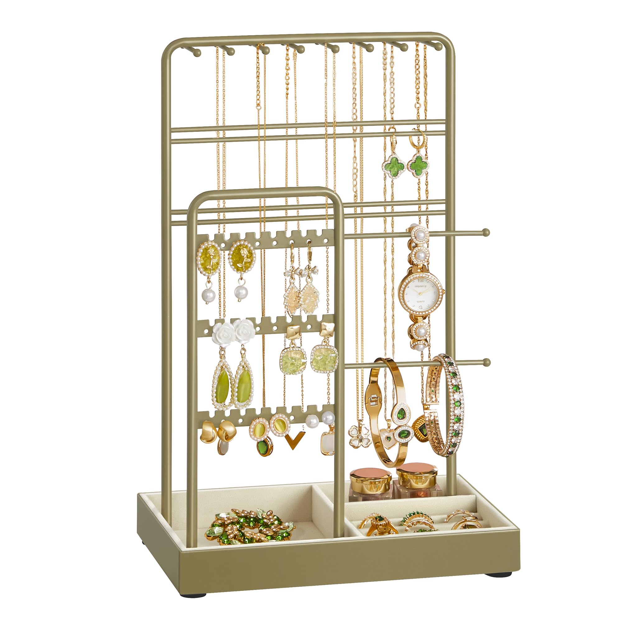 Die drei Rahmen mit großzügigem 5cm Abstand verhindern das lästige Verheddern von Ketten und Armbändern. Insgesamt bietet der Ständer Platz für 46 Paar Ohrringe, 20 Armbänder, 24 Ketten und im praktischen Samt-Tablett nochmal extra Stauraum für Ringe und andere Kleinigkeiten.