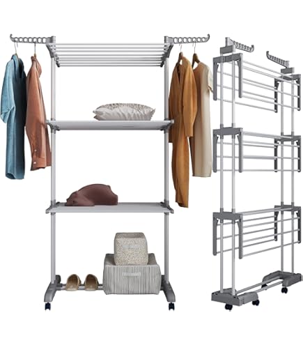Endlich Schluss mit Wäschebergen! Der Belfoyer Wäscheständer ist dein neuer bester Freund - ob in der Wohnung, auf dem Balkon oder im Garten. Mit 4 praktischen Ebenen hast du massig Platz für Shirts, Handtücher und sogar große Bettlaken. Einfach aufklappen, Wäsche drauf und fertig! Und wenn du mal keinen Platz brauchst, klappst du ihn einfach zusammen - super praktisch für kleine Wohnungen. Die 4 Rollen mit Bremsen machen ihn total mobil: Schieb ihn einfach in die Sonne oder weg in die Ecke. Hergestellt aus robustem Edelstahl hält er bis zu 35 kg aus - da kannst du getrost auch mal die komplette Wochenwäsche draufhängen. Die verstellbaren Ebenen passen sich deinen Wäschestücken an, egal ob lange Hosen oder kleine Socken. Wetterfest ist er obendrein, also kein Problem bei Regen oder Sonne. Montage? Einfach und schnell - in wenigen Minuten bist du startklar!