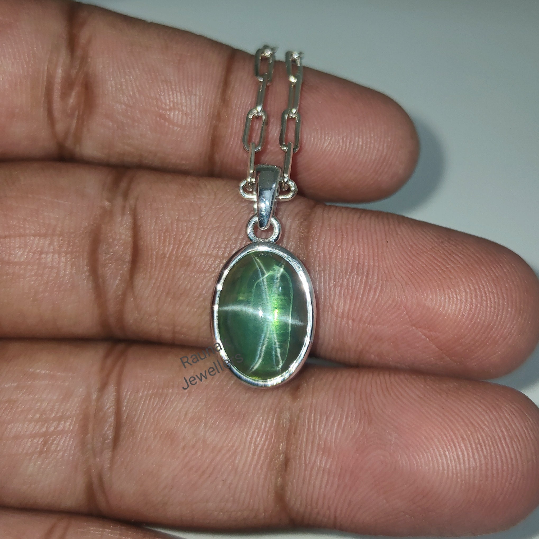 Ein absolutes Unikat für echte Schmuckliebhaberinnen! Dieser wunderschöne Anhänger zeigt einen natürlichen grünen Sternsaphir in 18 Karat, der einen faszinierenden sechsstrahligen Sterneffekt offenbart. Der Edelstein im eleganten Ovalschliff ist meisterhaft in 925er Sterlingsilber gefasst und kommt inklusive einer passenden Silberkette. Mit einem Gewicht von ca. 3-4 Gramm liegt der Anhänger angenehm schwer um den Hals. Jedes Stück ist handgefertigt - das garantiert höchste Qualität und macht jeden Anhänger einzigartig. Perfekt für besondere Anlässe oder als Statement-Piece für den täglichen Gebrauch. Erhältlich in verschiedenen Größen, damit du deine perfekte Passform findest. Ein zeitloses Schmuckstück, das garantiert Komplimente erntet!