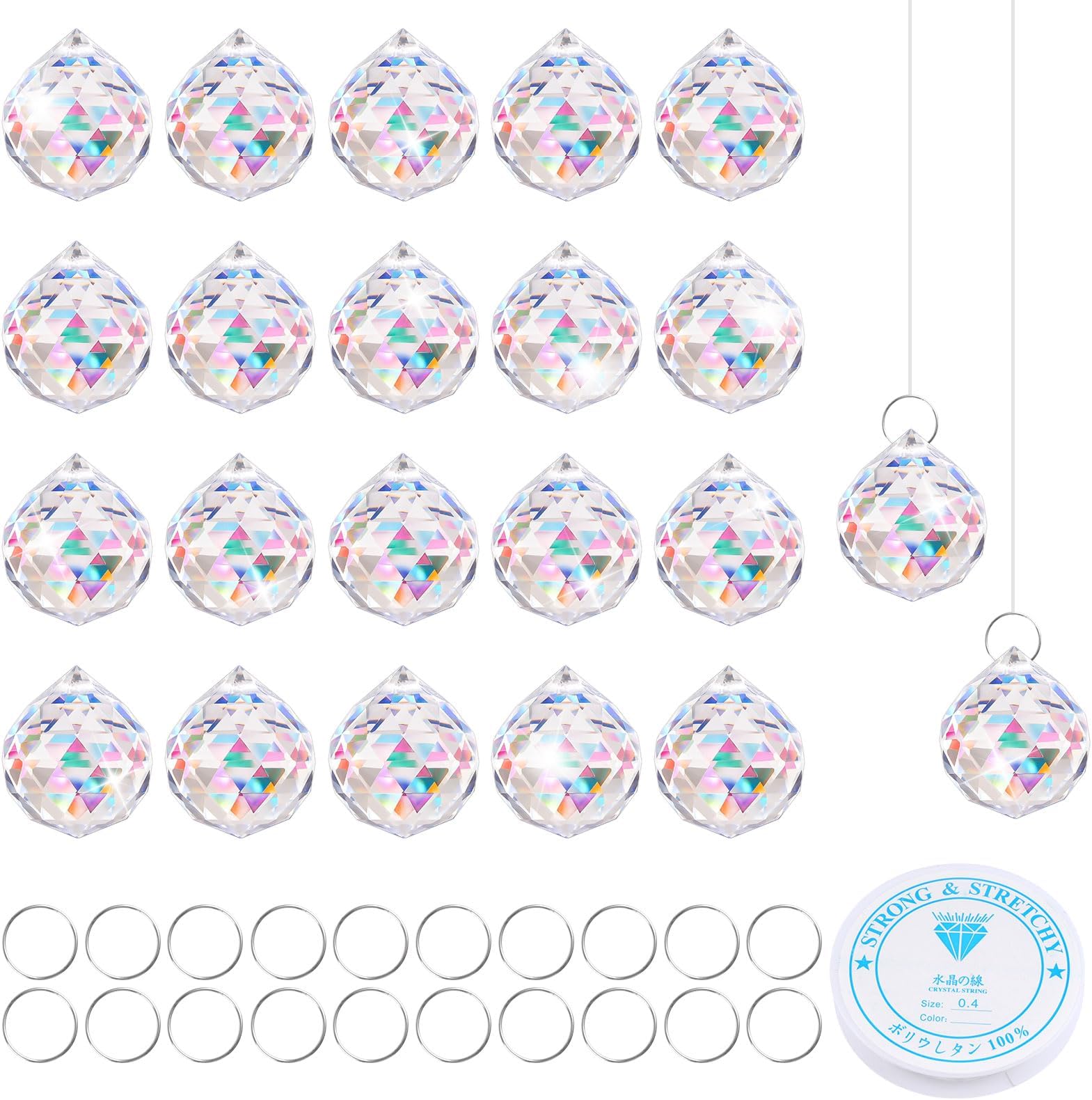 Verwandle dein Zuhause in ein Regenbogen-Paradies! Diese 24 Kristall-Anhänger fangen das Sonnenlicht ein und werfen wunderschöne Regenbogenfarben in den Raum. Jede Kristallkugel hat 20mm Durchmesser und ist facettiert geschnitten für maximale Lichtbrechung. Mit Aufhängebohrung oben - einfach mit nem Faden oder Ring aufhängen. Perfekt für Fenster, Kronleuchter, Vorhänge oder als Weihnachtsbaumschmuck. Komplett transparent und funkelt wunderschön, wenn die Sonne drauf scheint. Im Set inklusive Aufhängedraht. Super für Bastelprojekte, Hochzeitsdeko oder einfach zur Verschönerung der Wohnung. Macht auch als Geschenk was her!
