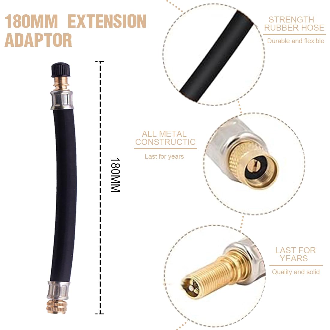 Endlich easy Luft nachfüllen! Diese Ventilverlängerungen sind der Retter für schwer erreichbare Reifenventile. Das Set enthält 8 Teile: 180mm lange Gummiverlängerungen und 90-Grad-Messingadapter. Aus verschleißfestem Gummi und Messing - halten hohen Druck und Temperaturen stand. Die rechtwinkligen Adapter machen das Befüllen in engen Radkästen zum Kinderspiel. Einfach auf das Ventil schrauben - die Gummidichtungen verhindern Luftverlust. Perfekt für Vorder- und Hinterreifen gleichermaßen. Passt für Autos, LKWs, Motorräder, Wohnmobile und sogar Fahrräder - einfach universell einsetzbar. Kein Herumgefummel mehr mit zu kurzen Füllstutzen! Mit 107g Gesamtgewicht leicht und platzsparend verstaubar. Einfach in der Anwendung: Adapter aufschrauben, Luft einfüllen, wieder abschrauben - fertig! Macht die Reifenwartung so viel einfacher.