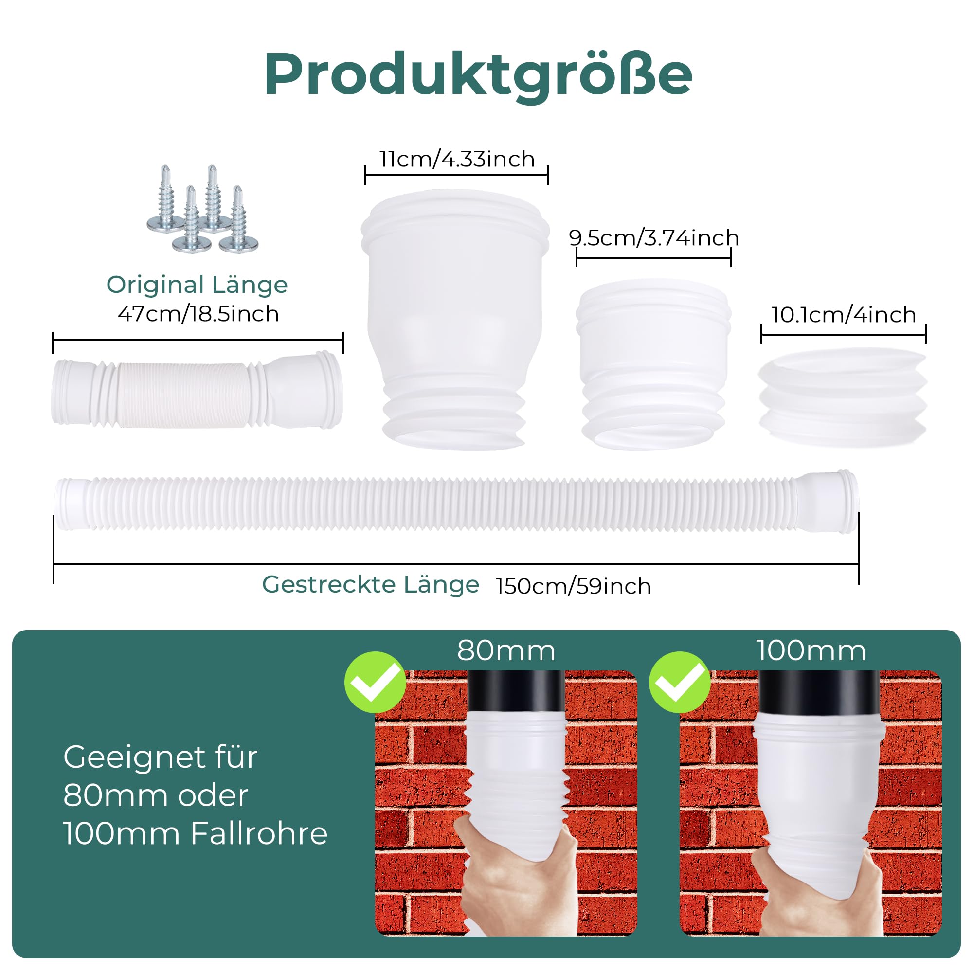 Regenwasser clever ableiten - mit dieser praktischen Fallrohr-Verlängerung! Das teleskopierbare Modell aus stabilem PE-Material passt sich flexibel von 20 bis 59 Zoll Länge an und ist damit ideal für fast jede Dachrinne. Perfekt für Fallrohre mit 80-100mm Durchmesser. Die verdickte Wand macht das Rohr besonders robust und langlebig - kein Verformen oder Brechen mehr! Das Spritzschutz-Design sorgt dafür, dass keine Wasserflecken an der Hauswand entstehen. Einfach ans bestehende Fallrohr stecken und schon wird das Regenwasser sicher vom Haus weggelenkt. Korrosionsbeständig und witterungsfest - hält viele Jahre. Einfache Lösung für bessere Entwässerung!