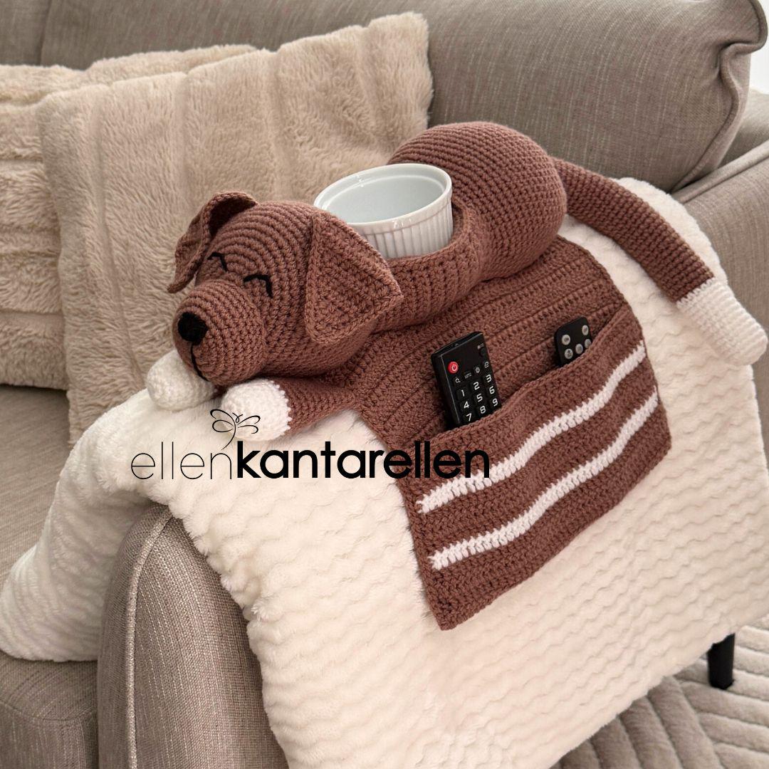 Endlich Ordnung auf der Couch! Dieser niedliche Häkel-Organizer mit Hunde-Motiv hält all deine Kleinigkeiten griffbereit. Mit praktischem Getränkehalter, der auslaufsicher ist - perfekt für Filmabende!\\n\\nHandgehäkelt aus weichem Garn, etwa 45x28 cm groß. Zwei Taschen für Fernbedienung, Handy, Snacks oder Brille. Rutschfeste Unterseite sorgt für stabilen Halt auf der Armlehne.\\n\\nDas süße Hunde-Design bringt Gemütlichkeit in dein Wohnzimmer. Einfach über die Armlehne stülpen und schon hast du alles Wichtige in Reichweite. Auch ein tolles Geschenk für Tierliebhaber!\\n\\nMaße: 45x28 cm | Material: Weiches Garn | Mit Getränkehalter | 2 Aufbewahrungstaschen | Handgehäkeltes Hunde-Design