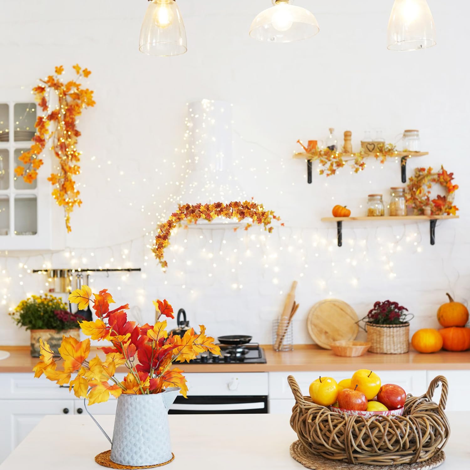 Bring herbstliche Gemütlichkeit in dein Zuhause mit dieser wunderschönen Ahornblatt-Girlande! Mit 175 cm Länge perfekt für Tür, Wand, Kamin oder Garten. Die Blätter sehen total natürlich aus - mit realistischen Farbverläufen und Venen-Details. Aus langlebigem Stoff und Kunststoff, verblasst nicht in der Sonne! Im Lieferumfang: 1 Girlande + 2 Aufhängehaken. Super für Herbstpartys, Erntedankfest, Halloween oder einfach so für eine gemütliche Atmosphäre. Und das Beste: Die Girlande ist wiederverwendbar! Einfach zusammenfalten und nächstes Jahr wieder herausholen. Mach dein Zuhause zur herbstlichen Wohlfühloase - ohne dass echte Blätter durcheinanderfliegen!