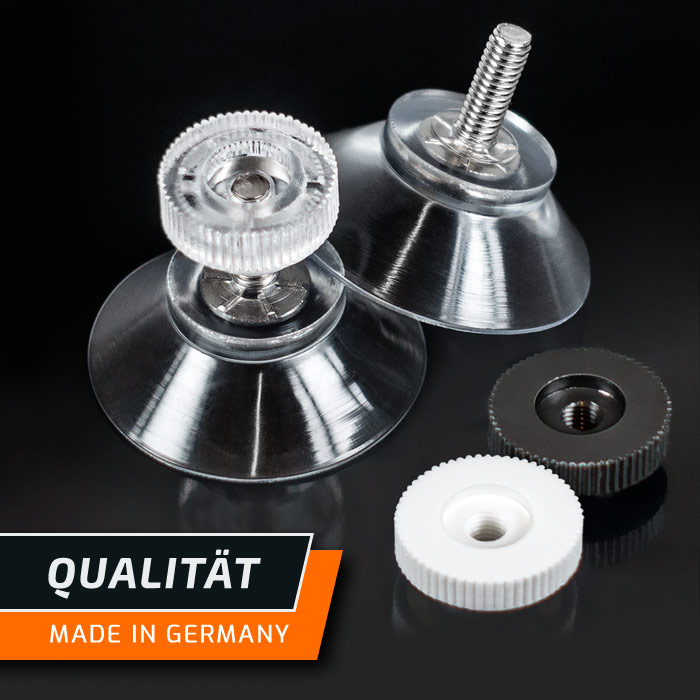 Hergestellt in Deutschland mit transparenten Gummisaugnäpfen und eingespritzten Edelstahlschrauben. Der Vakuum-Effekt sorgt für starke Haftkraft auf glatten, fettfreien Oberflächen.