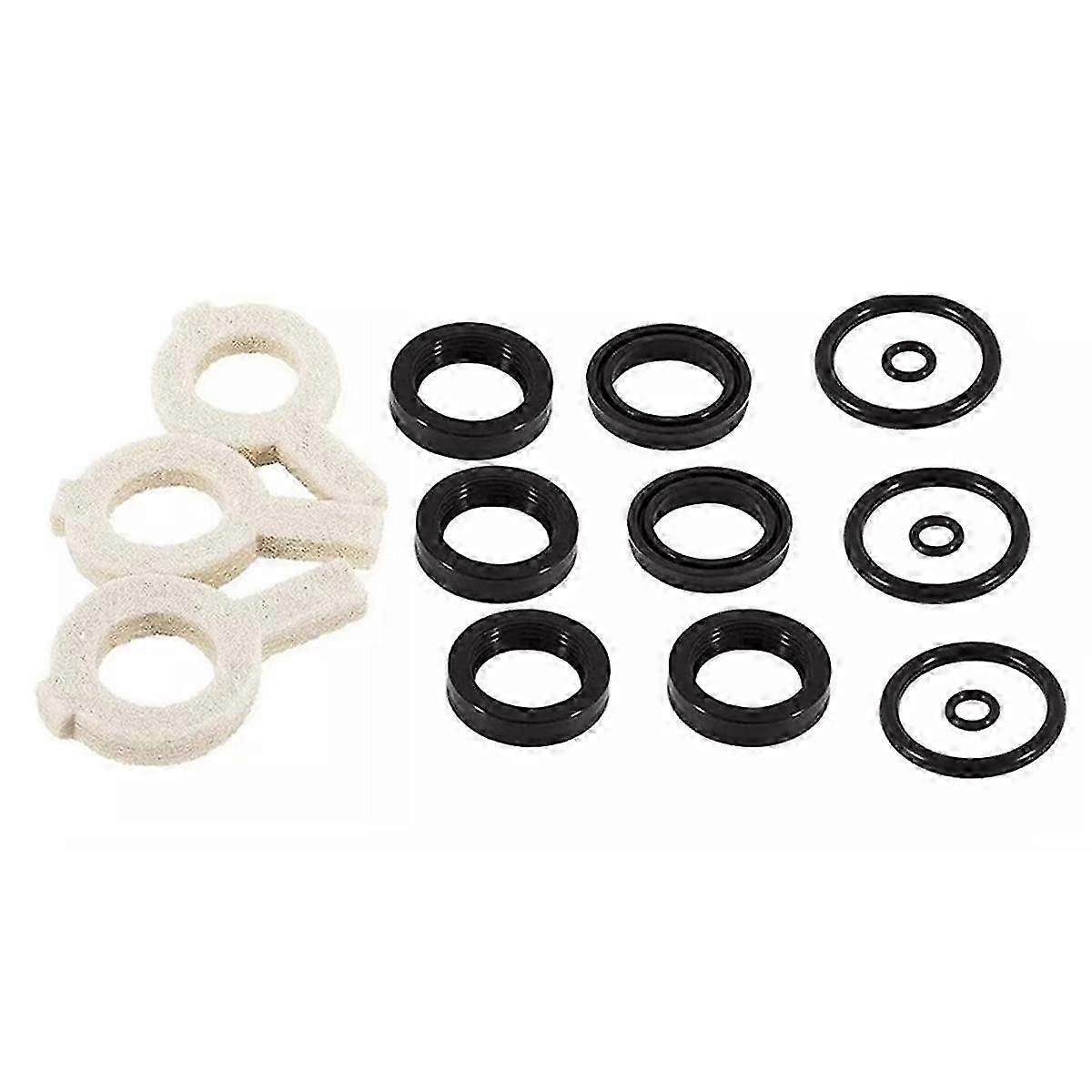 Im Lieferumfang sind alle notwendigen Teile: 3 Hochdruckdichtungen mit S-Dichtung (43307), 3 Niederdruckdichtungen (43305), 3 Dichtungsgehäuse-O-Ringe (14200), 3 Kolbenhalter-O-Ringe (17399) und 3 Dochte mit langer Schlaufe (43302).