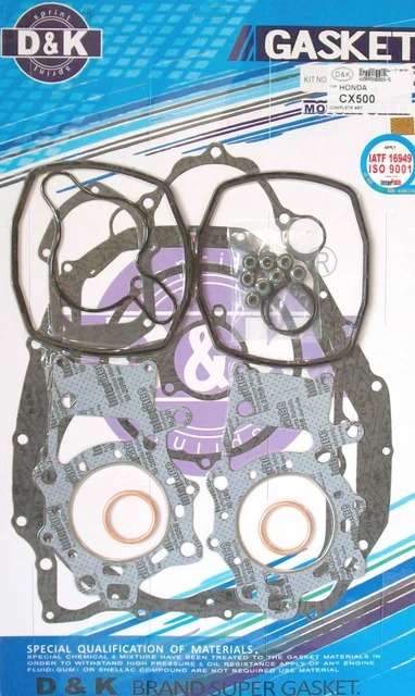 Alles dicht? Dieser komplette Motor-Dichtsatz bringt deine Honda CX 500 (Baujahr 1977-1986) wieder in Top-Zustand! Enthalten sind alle wichtigen Dichtungen rund um Motor und Getriebe - genau nach originaler Form und Funktion. Darunter Zylinderkopf-, Ventildeckel- und Ventilschaftdichtungen, Ansaug- und Krümmerdichtungen sowie Dichtungen für Nockenwellendeckel, Kupplungsdeckel, Wasserpumpe, Thermostat, Anlasser und Getriebedeckel. Perfekt passend für Honda CX 500 Modelle von 1977-1983, CX 500 C Custom von 1980-1984, CX 500 E Euro Sports von 1982-1986 und GL 500 D Silverwing von 1982-1983. Ob bei einer Generalüberholung oder zur Vorbeugung von Undichtigkeiten - mit diesem Komplett-Set bist du auf der sicheren Seite! Hochwertige Verarbeitung garantiert perfekten Sitz und lange Haltbarkeit. Mach deine Honda wieder fit für die Straße und genieße sorgenfreie Motorrad-Touren! Ein unverzichtbares Set für jede CX 500 Restauration oder Instandhaltung. Dein Oldtimer wird es dir danken!