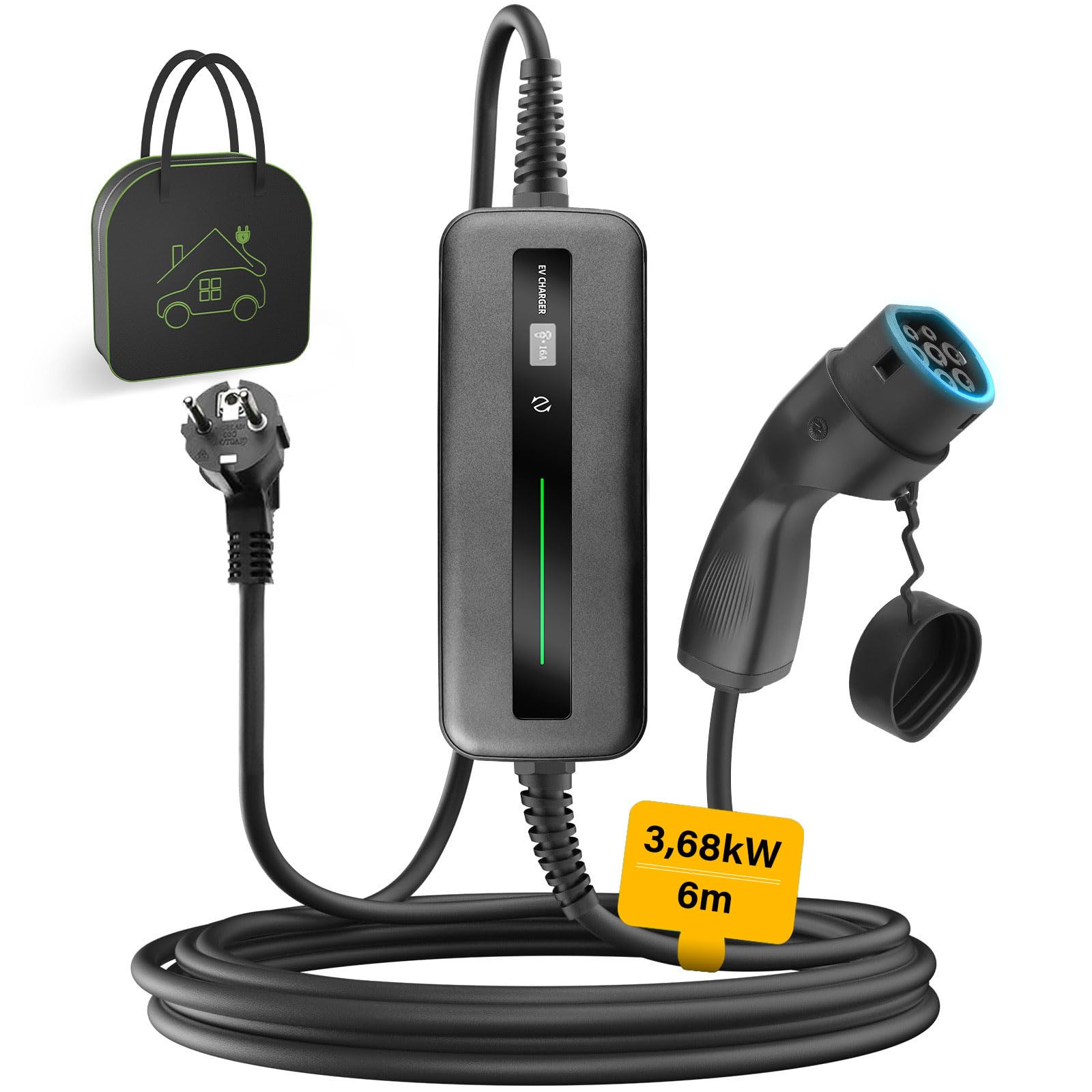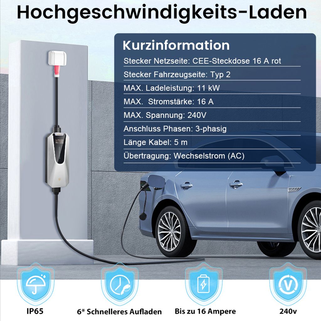 Lade dein E-Auto dreimal schneller als mit der Haushaltssteckdose! Die Evjuicion Mobile Wallbox verwandelt jede CEE-16A-Dose in eine powerhouse Ladestation. Mit 11kW Ladeleistung und 6 Metern Kabellänge bist du flexibel beim Parken. Das große 2,4-Zoll Display zeigt dir alle wichtigen Daten auf einen Blick - Ladeleistung, Stromstärke und verbleibende Ladezeit. Per Tastendruck stellst du die Stromstärke von 6A bis 16A ein und programmierst den Ladestart für günstige Nachtstromtarife. Der IP67-Schutz macht das Ladekabel wetterfest und die robuste Bauweise hält selbst extreme Temperaturen aus. Kompatibel mit Tesla Model 3/Y, VW ID-Modellen, BMW i-Serie und vielen mehr. Komplettset inklusive Tragetasche und Wandhalterung!