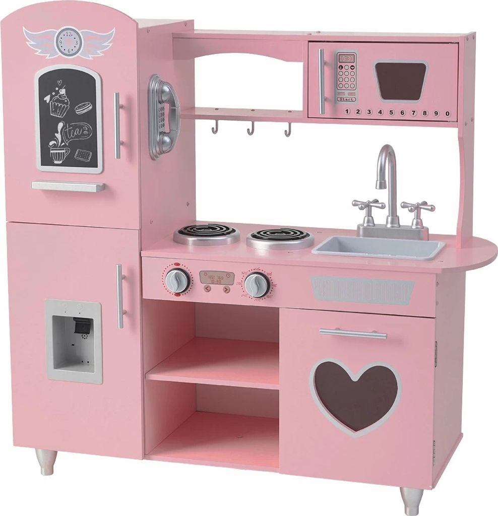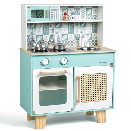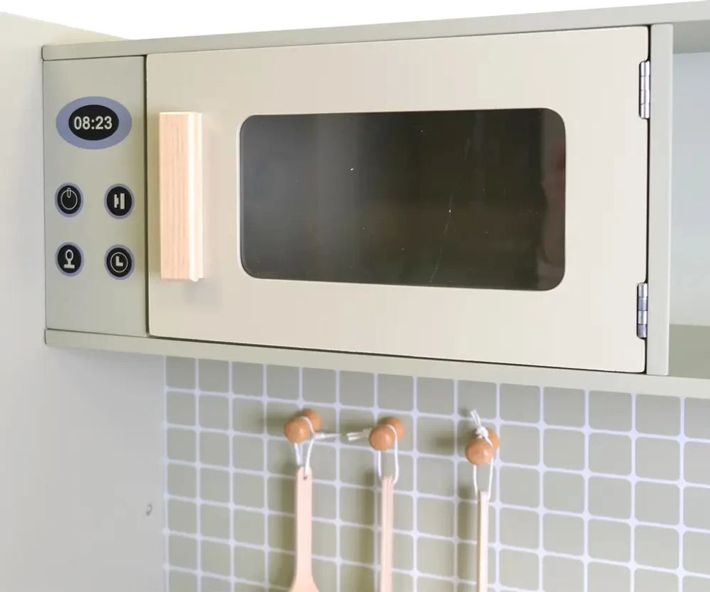 Suchst du nach dem perfekten Geschenk für kleine Nachwuchsköche? Diese wunderschöne Spielküche aus Holz im modernen Grün bringt Kinderaugen zum Leuchten! Mit ihren stattlichen 99x31x100 cm bietet sie jede Menge Platz zum Kochen, Backen und Spielen.