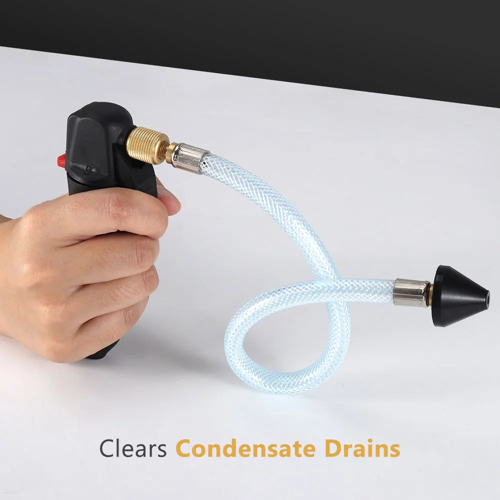 Verstopfte Klimaanlagen-Abläufe? Diese CO2-Ablasspistole macht Schluss mit dem Ärger! Statt mit Wasser zurückzuspülen, nutzt du umweltfreundliches CO2 - ein natürlicher Bestandteil der Luft. Die Pistole aus ABS wiegt nur 157g und ist damit super leicht und handlich. Kein Schleppen von schweren Lufttanks mehr! Mit flexiblem Schlauch kommst du auch an schwer zugängliche Stellen ran. Einfach CO2-Kartusche aufschrauben und los geht's. Viel sicherer und umweltfreundlicher als chemische Reiniger. Deine Klimaanlage wird's dir danken - und deine Nase auch!