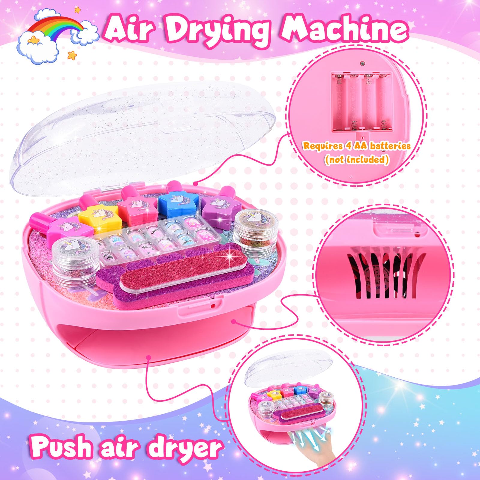 Das ultimative Nagelstudio für kleine Prinzessinnen! Dieses komplett Set in süßem Rosa enthält alles für den perfeken Mädchen-Spaß: 5 herzförmige Nagellacke, Nageltrockner, Nagelfeile, Zehentrenner, Nagelglitter in Gold und Silber, Beauty-Palette mit 12 Farben, coole Nagelaufkleber und 12 künstliche Fingernägel. Der besondere Clou: Der Nagellack ist abziehbar und waschbar! Kein nerviger Nagellackentferner nötig - einfach mit Wasser und Seife abwaschbar oder abziehen. Total sicher und ungiftig - made from high-quality BAP material. Der Nageltrockner bläst Luft bei Raumtemperatur - keine Verbrennungsgefahr! Alles kann praktisch im Nageltrockner-Fach aufbewahrt werden. Perfekt für Mädchen von 5-11 Jahren - fördert Kreativität und Feinmotorik. Ideal für Geburtstage, Kinderpartys, Weihnachten oder einfach als Überraschung. Deine Tochter kann ihren eigenen Nagelsalon eröffnen und mit Freundinnen stylische Nagel-Kunst kreieren. Stundenlangen Spielspaß garantiert!