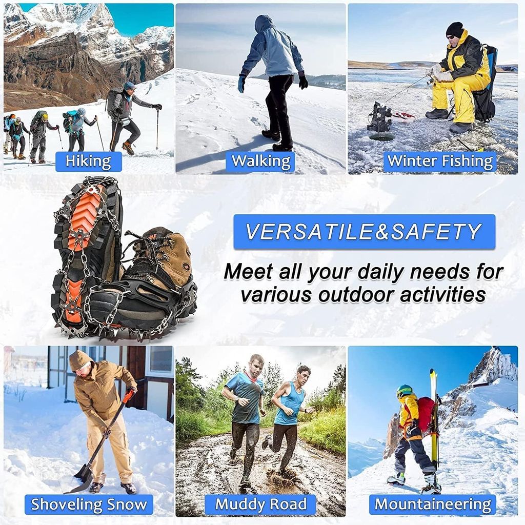 Sicherheit geht vor - besonders bei rutschigem Untergrund! ❄️ Diese Steigeisen mit 10 Zähnen aus robustem Manganstahl geben dir auf Eis, Schnee und rutschigen Wegen den Halt, den du brauchst. Einheitsgröße für Schuhgrößen 36-45 - passt also fast jedem!\n\nWas diese Steigeisen so besonders macht: Die wärmebehandelten Dichtungsplatten sind extrem stabil und halten auch den härtesten Bedingungen stand. Die 10 Spitzen haben unterschiedliche Längen (bis 18mm) und bieten dir in jeder Situation optimalen Grip.\n\nDer hochelastische Naturkautschuk (NR) ist nicht nur mega langlebig, sondern passt sich auch perfekt deinen Schuhen an - super bequem und flexibel! Egal ob du wanderst, bergsteigst, im Winter angeln gehst oder einfach nur auf glattem Boden unterwegs bist - mit diesen Steigeisen bist du auf der sicheren Seite.\n\nPraktisches Extra: Die inkludierte Tragetasche aus strapazierfähigem Nylon! So durchbohren die Stacheln nicht deinen Rucksack und du kannst die Steigeisen einfach transportieren. Die Steckplatte ermöglicht außerdem schnelles Trocknen - keine Angst vor Schimmel oder unangenehmen Gerüchen.\n\nEinfach über die Schuhe ziehen, feststellen und los geht's! Deine Sicherheit ist es wert - mit diesen Steigeisen meisterst du jeden Winterweg ohne Rutschpartien. Gutes Gelingen! 🏔️