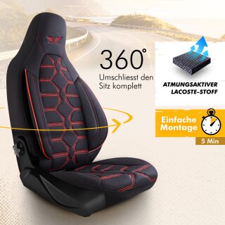 Mach deinen VW Bus gemütlich! Diese Sitzbezüge in Rot-Schwarz sehen nicht nur mega aus, sondern sind auch super praktisch. Aus JAKAR Baumwolle gefertigt, sind sie im Sommer angenehm kühlend und im Winter wärmend. Perfekt für alle T4, T5 und T6 Besitzer!\\n\\nDie Montage ist kinderleicht - dank cleverer Klemmverbindungen und Zugbänder sitzt alles rutschfest und passgenau. Auch die Kopfstützen werden komplett verdeckt, selbst wenn sie nicht abnehmbar sind. Das Set enthält zwei Einzelsitzbezüge für Fahrer und Beifahrer.\\n\\nAber Achtung: Diese Bezüge sind NICHT für Fahrzeuge mit Airbags geeignet! Wenn dein VW Airbags in den Sitzen hat, such besser nach einer anderen Lösung. Sicherheit geht vor!\\n\\nDie Bezüge sind bei 30°C waschbar, haben verstärkte Flanken für extra Komfort und sind sogar Sitzheizung-kompatibel. Ob lange Roadtrips oder tägliche Fahrten - mit diesen Bezügen sitzt du einfach besser.\\n\\nWert deinen Innenraum richtig auf und schütz gleichzeitig die Originalsitze vor Verschleiß. Sieht aus wie neu, fühlt sich an wie neu - aber ohne den hohen Preis für komplette Sitzerneuerung!