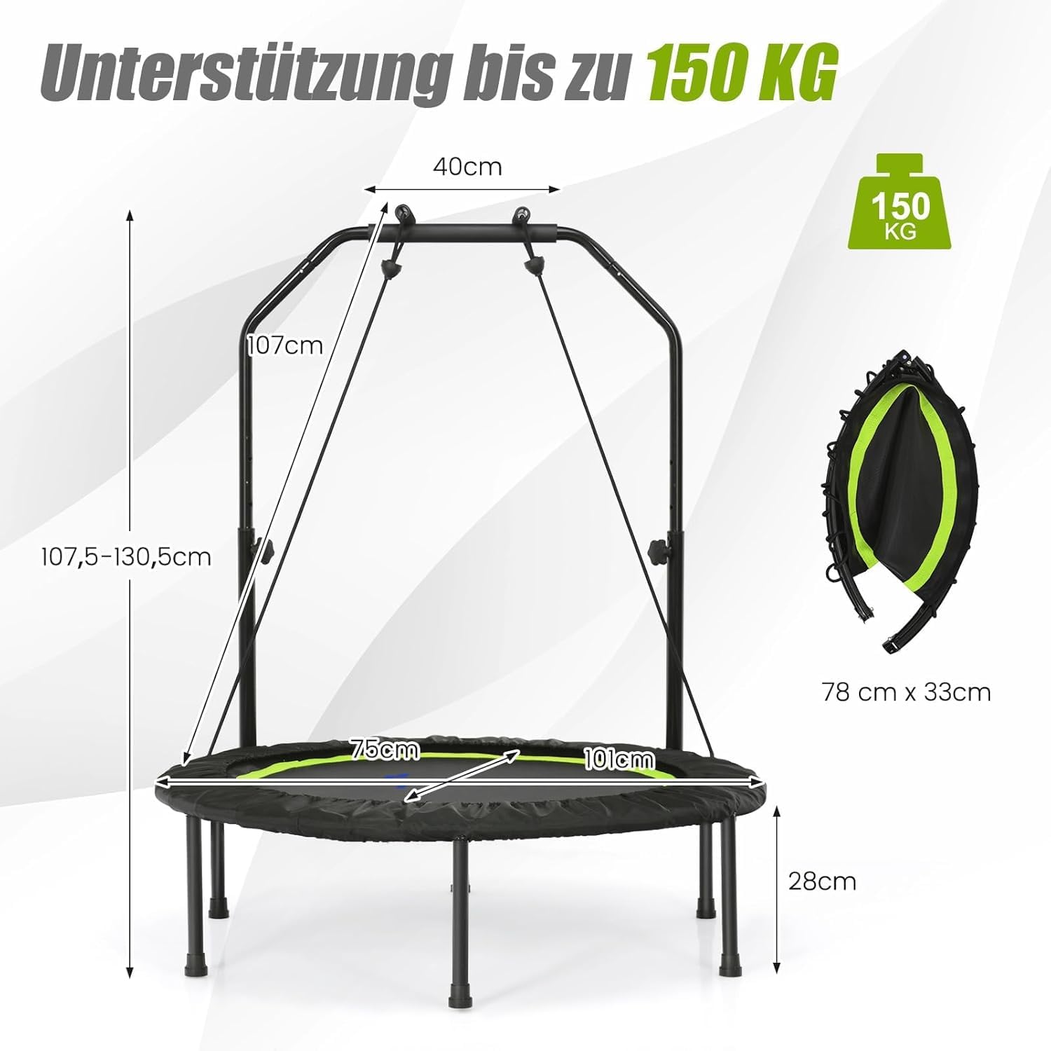 Springen, lachen, Spaß haben - dieses FANTASK Trampolin bringt Bewegung in deinen Garten! Mit 154x90cm Sprungfläche und 150kg Tragkraft ist es perfekt für zwei Kinder oder auch mal ein Erwachsener mit Kind. Die 32 starken Federn und die reißfeste PP-Sprungmatte sorgen für super Sprungerlebnisse. Besonders praktisch: Der Haltegriff ist 5-stufig von 92-132cm verstellbar und damit für verschiedene Größen ideal. Die Schaumstoffpolsterung gibt sicheren Halt. Der stabile Stahlrahmen mit 6 Beinen steht bombenfest, und die rutschfesten Untersetzer schützen deinen Boden und reduzieren den Lärm. Nach dem Springen klappst du es einfach zusammen - platzsparend für die Aufbewahrung. Trampolinspringen ist übrigens nicht nur lustig, sondern auch gesund: Es fördert die körperliche Entwicklung der Kinder, regt den Blutfluss an und verbrennt Kalorien. Also raus in den Garten und ab auf's Trampolin - der Spaß für die ganze Familie!
