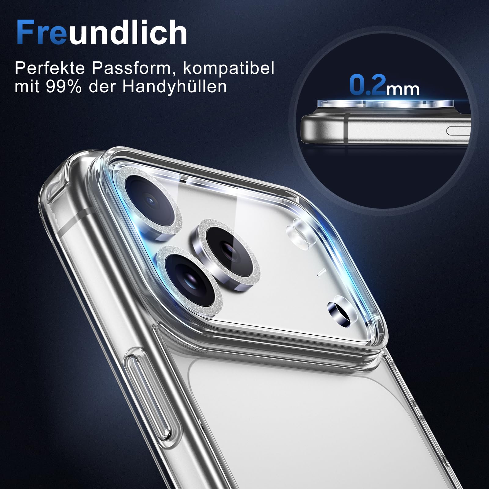 Schütze die wertvolle Kamera deines iPhone 17 Pro Max! Dieser hochwertige Kameraschutz aus 9H gehärtetem Glas mit Metallrahmen bewahrt deine Kameralinsen vor Kratzern, Stößen und Beschädigungen. Die 3 Stück galvanisierte Saphir-AF-Schutzfolie bietet Rundumschutz, während die 99,99% Lichtdurchlässigkeit für kristallklare Fotos sorgt. Besonders clever: Der verbesserte Nachtblitzkreis verhindert Blendung bei Blitzfotos - egal ob bei Tag oder Nacht. Die oleophobe Beschichtung weist Fingerabdrücke und Schmutz zuverlässig ab. Mit nur 0,2mm Aufbau passt der Schutz perfekt zu den meisten Handyhüllen. Die Installation ist super einfach dank elektrostatischer Adsorptionstechnologie - keine Blasen, keine Rückstände! Im Lieferumfang ist alles enthalten, was du brauchst: Der Kameraschutz plus Reinigungswerkzeuge. Wichtig: Nur für iPhone 17 Pro Max geeignet! In Dunkelblau und drei weiteren Farben erhältlich - so passt der Schutz perfekt zu deinem Style.