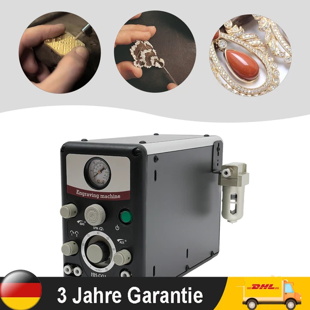 Wow, diese Graviermaschine ist ein absoluter Alleskönner für alle, die selbst Schmuck herstellen wollen! Mit zwei Köpfen kannst du gleich doppelt so schnell arbeiten und super präzise Gravuren auf Metall, Holz oder Kunststoff machen. Perfekt für individuelle Ohrringe, Armbänder oder Anhänger. \\n\\nDie Maschine ist zwar voll ausgestattet, aber trotzdem kompakt genug um sie einfach zu transportieren. Läuft super leise und hat ne super Feinjustierung - damit kriegst du auch die kompliziertesten Designs hin! \\n\\nTechnische Daten im Überblick: \\n• Doppelköpfiges System \\n• Leerlaufdrehzahl: 1–500 U/min \\n• Arbeitsgeschwindigkeit: 400-8000 Hübe/min \\n• Leistung: 45 W \\n• Spannzange: 3,17 mm (USA) oder 3,18 mm (EU) \\n• Mit Fußpedal für komfortable Bedienung \\n• Inklusive 2 Griffen, Schlauch und Filter \\n\\nEgal ob du Profi bist oder gerade erst anfängst - mit dieser Maschine machst du garantiert was her! Einfach Stecker rein, Material festspannen und los geht's mit dem Gravieren.