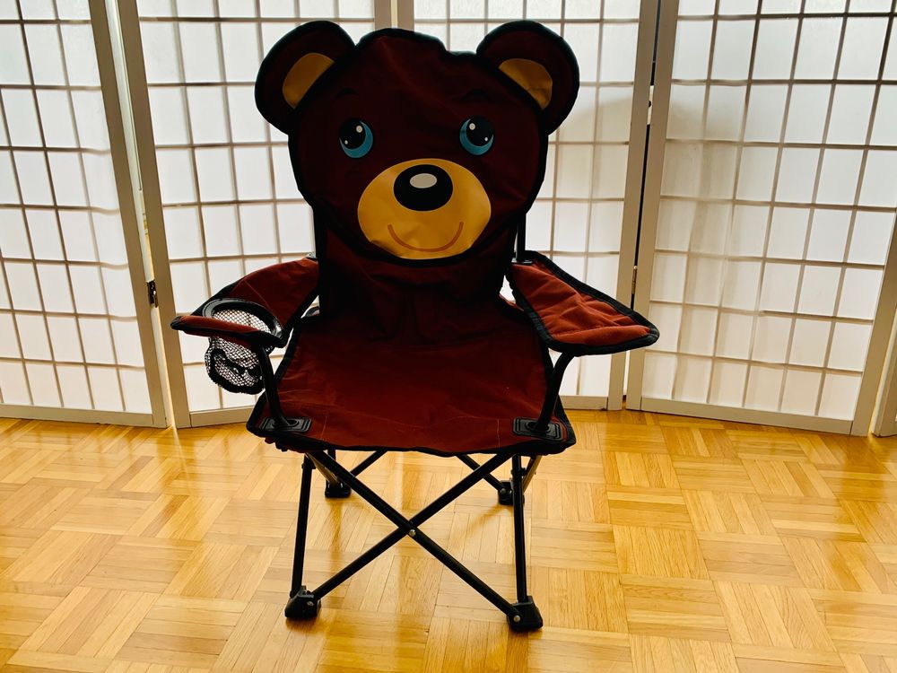 Hey, für die kleinen Outdoor-Fans ist dieser Spetebo Campingstuhl mit süßem Bären-Motiv genau das Richtige! Der klappbare Stuhl ist super praktisch für Ausflüge, Gartenfeste oder Camping. Mit dem integrierten Getränkehalter muss dein Kind nicht mal sein Lieblingsgetränk aus der Hand geben.\n\nMaßtechnisch ist er perfekt für Kinder: Die Sitzhöhe beträgt ca. 28 cm und die Sitzfläche 37x29 cm - da sitzt es sich bequem und kindgerecht. Das stabile Metallgestell ist pulverbeschichtet und hält einiges aus, während die Polyesterbespannung in schwarz-gelb richtig gut aussieht.\n\nWas ich besonders praktisch finde: Der Stuhl lässt sich ganz einfach zusammenklappen und kommt mit einer praktischen Tragetasche. So kann dein Kind seinen eigenen Stuhl selbst tragen - wie ein echter Outdoor-Profi!\n\nWichtig: Bitte nur auf festem, ebenem Boden verwenden und nicht für Kinder unter 3 Jahren geeignet. Aber für die größeren Kids wird's der absolute Lieblingsstuhl für alle Abenteuer draußen!