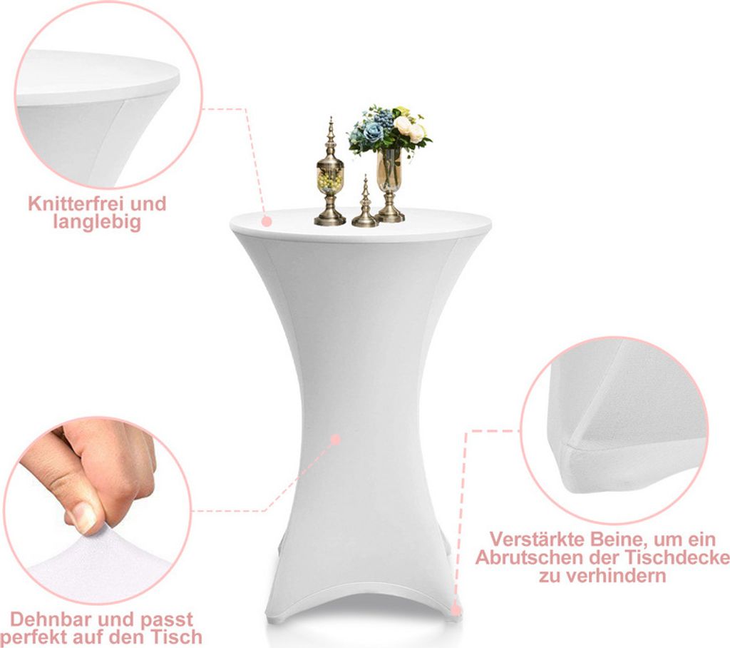 Diese stylische Stretch-Husse verwandelt deinen langweiligen Stehtisch in einen echten Hingucker! Perfekt für Gartenpartys, Hochzeiten oder Wiesn-Partys zu Hause. \\n\\nMit 70cm Durchmesser passt sie ideal auf Standard-Stehtische (110-120cm hoch). Aus strapazierfähigem Spandex/Polyester - super elastisch und bügelfrei. \\n\\nEinfach über den Tisch ziehen, fertig! Verstärkungen an den Füßen sorgen für perfekten Halt. Bei 30°C waschbar und schnell trocknend. \\n\\nDie weiß-blaue Kombination ist zeitlos elegant und passt zu jeder Party-Deko. Achtung: Nicht flammhemmend - also Abstand zu offenen Flammen halten!