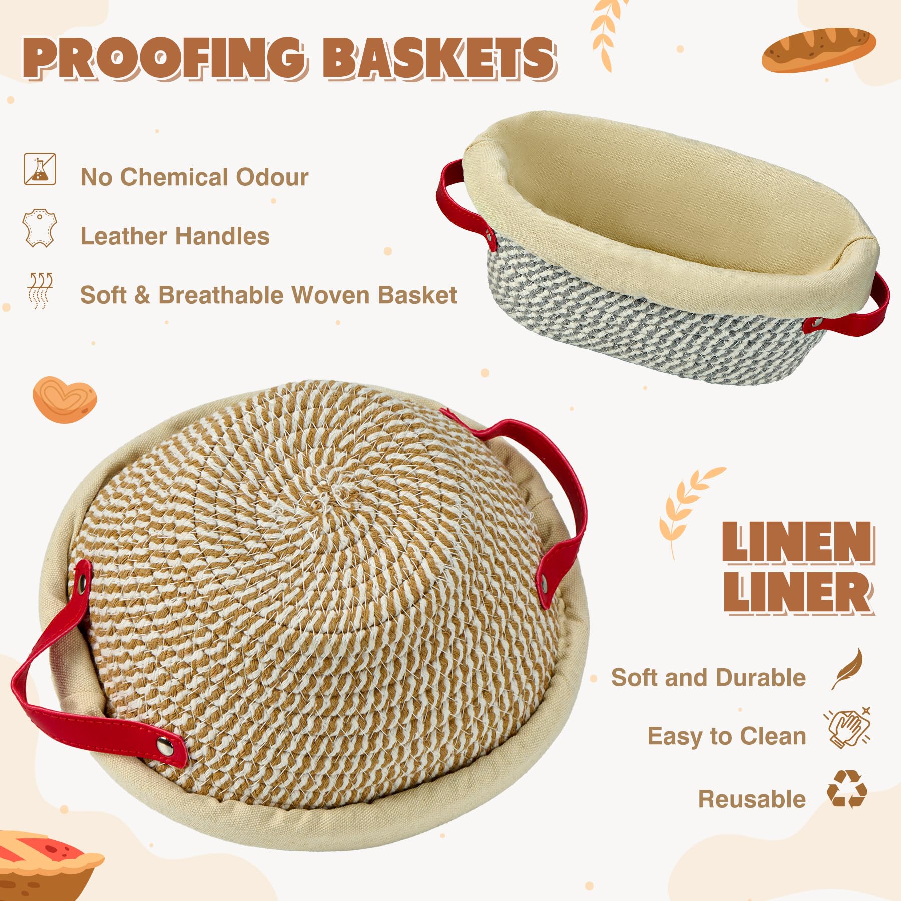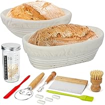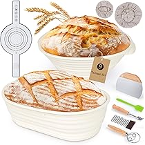 Das ultimative Starter-Set für Brotback-Fans! Mit 2 geflochtenen Gärkörbchen (oval & rund), Sauerteig-Glas, Teigschaber, Brotmesser mit 5 Klingen und allem was du brauchst. Die Gärkörbchen haben praktische Griffe und Leinenfutter für perfekte Brotformen. Das Brotmesser mit scharfen Klingen schneidet saubere Muster. Inklusive Brottüten und Silikonhandschuh für sicheres Arbeiten. Einfach losbacken und professionelle Ergebnisse erzielen!