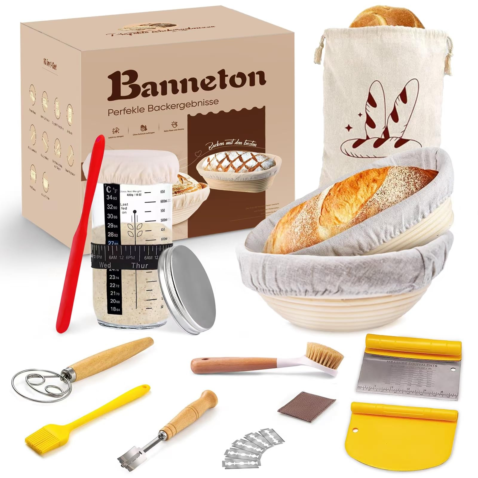 13-teiliges Brotback Set Mit Gärkörbchen - Komplettset Für Sauerteig Anfänger