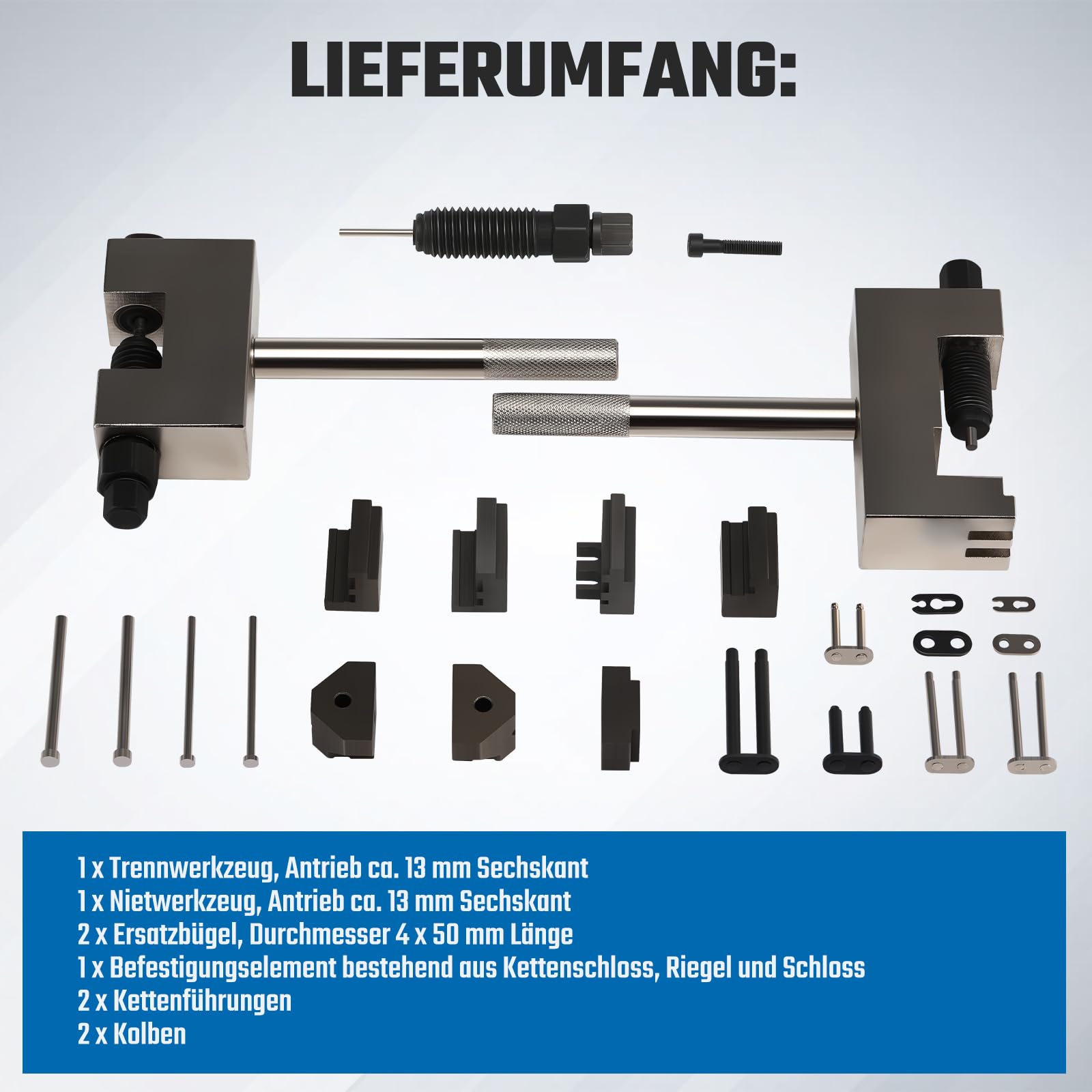 Hey Schrauber! Wenn du an Steuerketten arbeiten musst, ist dieses Nietwerkzeug-Set genau das Richtige für dich. Mit 13 Teilen hast du alles, was du brauchst, um Steuerketten professionell zu wechseln und zu nieten.\n\nDas Set ist speziell für 4mm Kettenbolzen gemacht und passt für verschiedene Mercedes, Chrysler und Jeep Modelle. Von A-Klasse über C-Klasse bis zu E-Klasse und vielen mehr - da ist dein Fahrzeug bestimmt dabei.\n\nDas Werkzeug ist aus hochwertigem Kohlenstoffstahl und super präzise verarbeitet. Die Gewinde laufen butterweich und das ganze Set kommt in einer praktischen Aufbewahrungstasche. So hast du alles ordentlich beisammen und kannst es leicht transportieren.\n\nWarum das Set? Beim Steuerkettenwechsel ist spezielles Werkzeug absolut notwendig. Mit normalen Werkzeugen kommst du da nicht weit und riskierst sogar, was kaputt zu machen.\n\nDie Bedienung ist einfach: Alte Kette ausliefern, neue Kette einbauen und mit dem Werkzeug vernieten. Meistens musst du nicht mal die ganze Steuerkette ausbauen.\n\nPerfekt für Werkstätten und ambitionierte Hobbyschrauber. Einfach bestellen und deine nächste Steuerketten-Arbeit wird zum Kinderspiel!