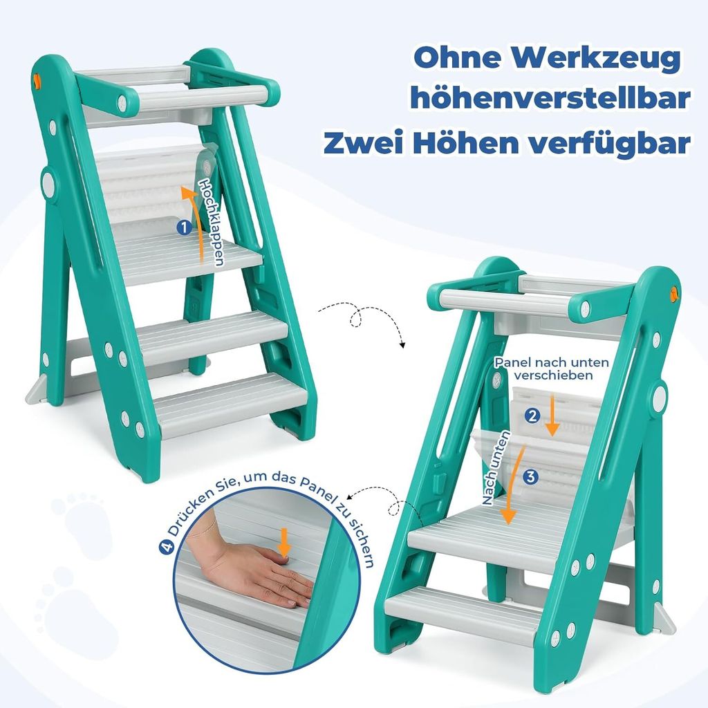 Dein kleiner Helfer in der Küche! Der Onasti Lernturm verwandelt dein Kind im Handumdrehen in einen begeisterten Küchenassistenten. Ab 1 Jahr geeignet und bis 6 Jahre höhenverstellbar - er wächst einfach mit! Die patentierte 'A'-Form mit Sicherheitsgeländer und rutschfesten Pads sorgt für maximalen Halt. Der flexible Sicherheitsbügel schützt vor dem Herunterfallen und kann später umgeklappt werden. Aus BPA-freiem PE-Material, wasserfest und super leicht zu reinigen. Inklusive Wasserhahnverlängerer für selbstständiges Händewaschen. Zusammenklappbar für platzsparende Aufbewahrung und in nur 10 Minuten montiert. So macht Lernen und Helfen richtig Spaß!